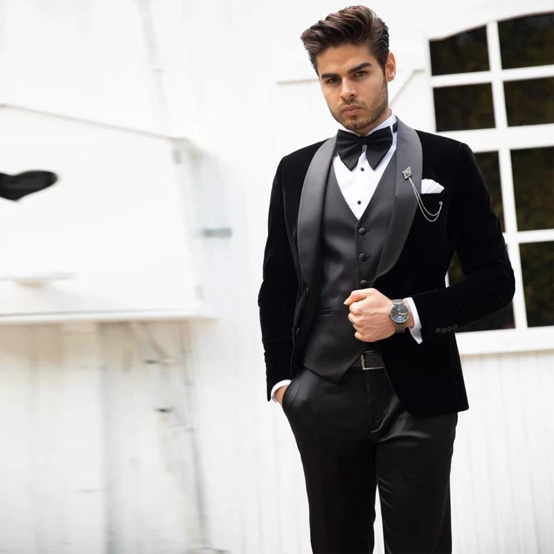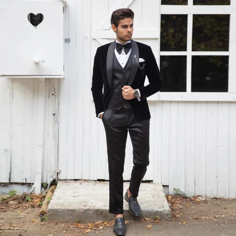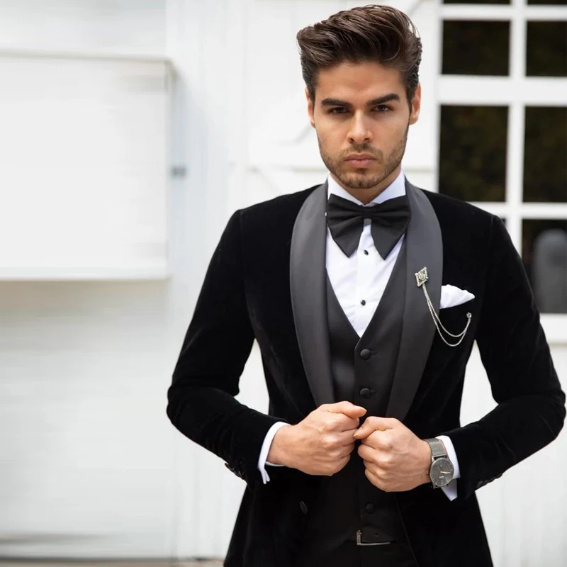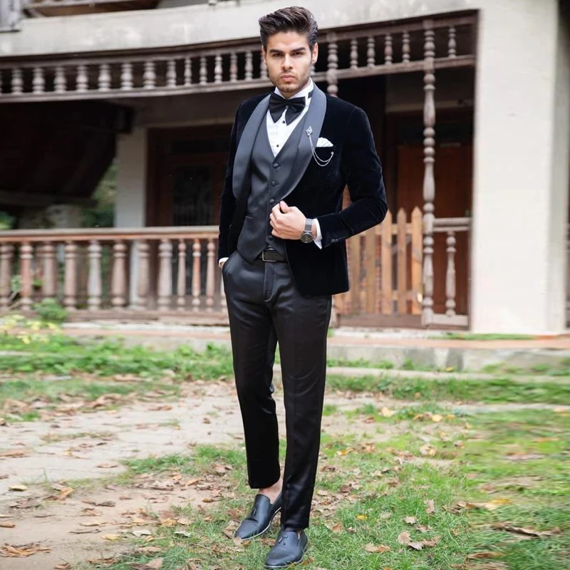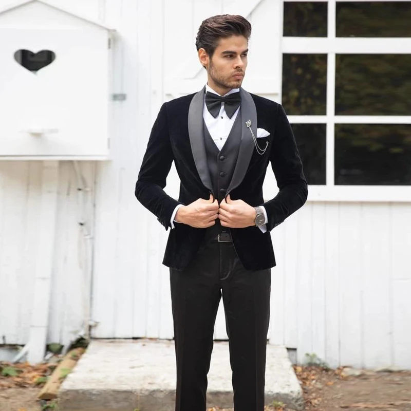 Классические мужские свадебные смокинги 3 шт., бархатная нежная одежда для жениха с лацканами, приталенный пиджак для шафера, брюки, блейзер на одной пуговице