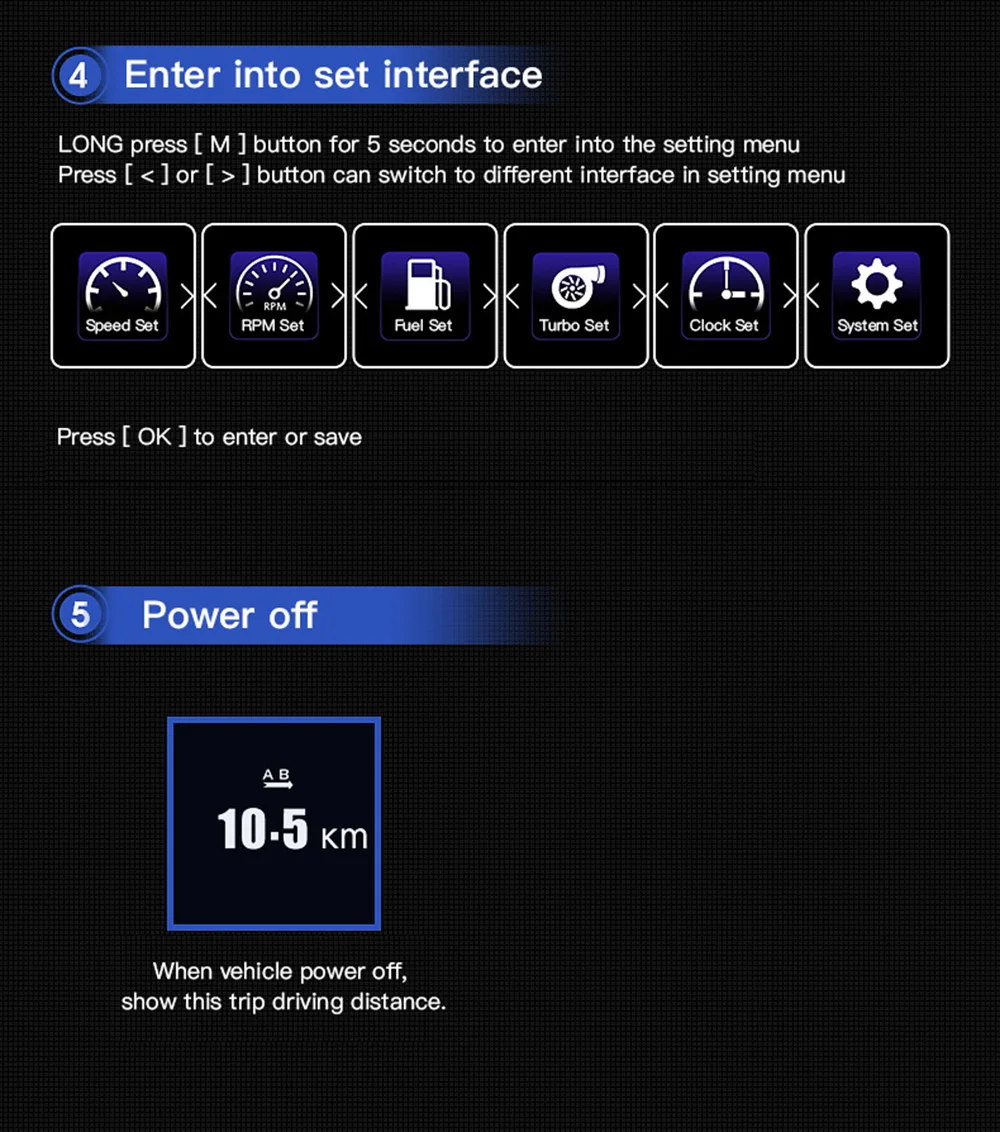1. Двойная система OBD + GPS.2. Два способа установки, установка столба + установка центральной консоли. Первый секундомер, который может быть установлен на А-столбе.3. В настоящее время первый экран может вращаться на 270 градусов.4. Первая Небольшая Таблица кодов HUD достигает наивысшего разрешения 240*240 для дисплея высокой четкости.5. Существует три типа давления турбины: PSI, 100 кПа, бар. Значение турбины может быть отрегулировано и откалибровано, чтобы увеличить расход топлива единицы км/л.6. Частота обновления до 10 Гц, не будет задержки.7. Функция GPS может отображаться одновременно в режиме OBD, который в настоящее время является первым в отрасли. Когда скорость переключается на миль в час, температура воды будет автоматически переключаться на градусы по Фаренгейту, одиночное расстояние вождения также будет автоматически переключаться на мили, И расход топлива также будет автоматически переключаться на галлоны MPG.8. 8 видов экранов могут быть переключены.9. Функция: Режим OBD2: скорость, об/мин, температура воды, напряжение, расход топлива, часы, одно расстояние, одно время в пути, температура моторного масла, давление турбины, испытание на ускорение, испытание на тормоз, сверхскоростная сигнализация, сигнализация неисправности двигателя, устранение кода неисправности, сигнализация температуры воды, сигнализация скорости, Сигнализация напряжения, переключатель миля, напоминание о усталости вождения, автоматическая и ручная регулировка яркости.10. Режим GPS: скорость в час, высота, количество сателлитов, часы, пробег в поездке, время в поездке, компас.