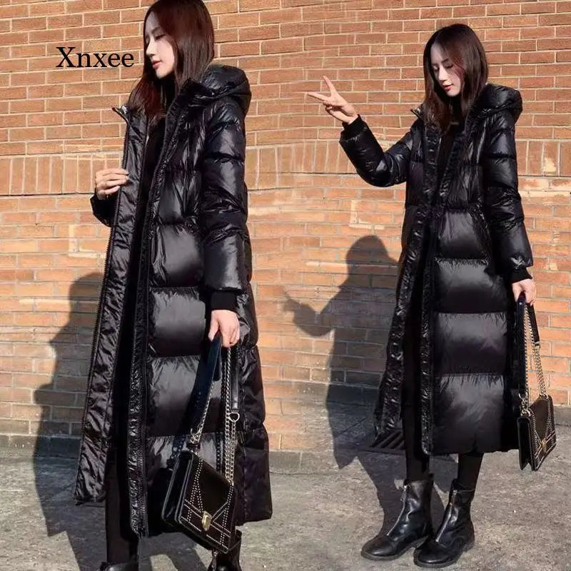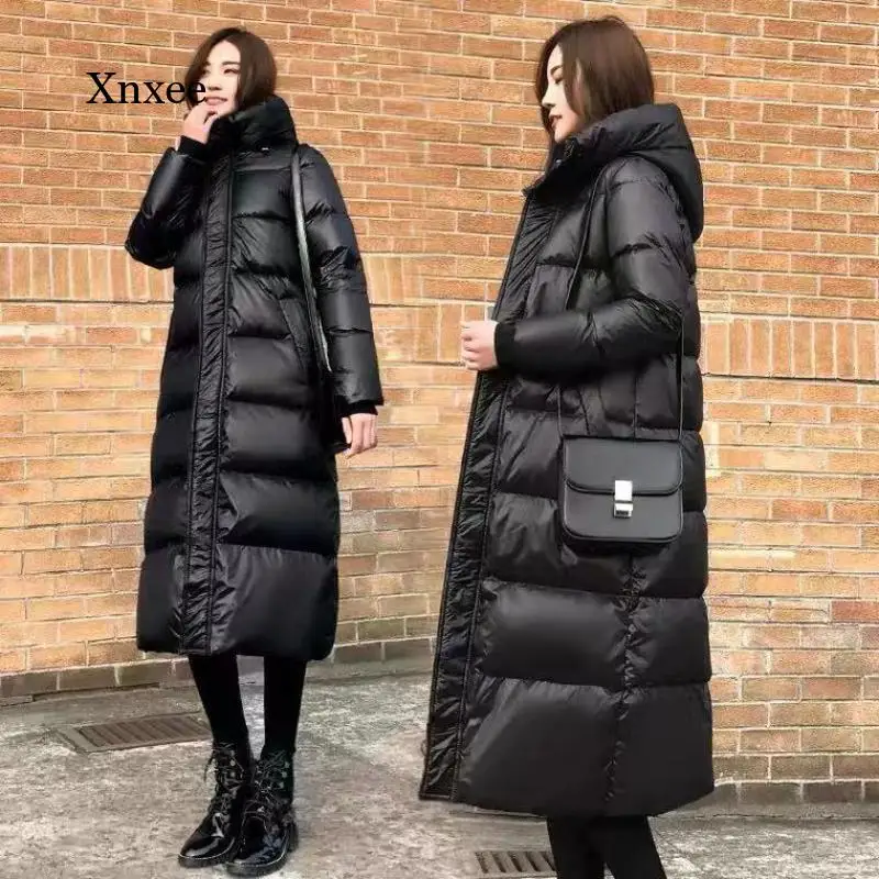 Пальто с капюшоном, глянцевая парка, женское модное утепленное пальто, зимняя свободная длинная куртка, Женская ветрозащитная непромокаемая верхняя одежда