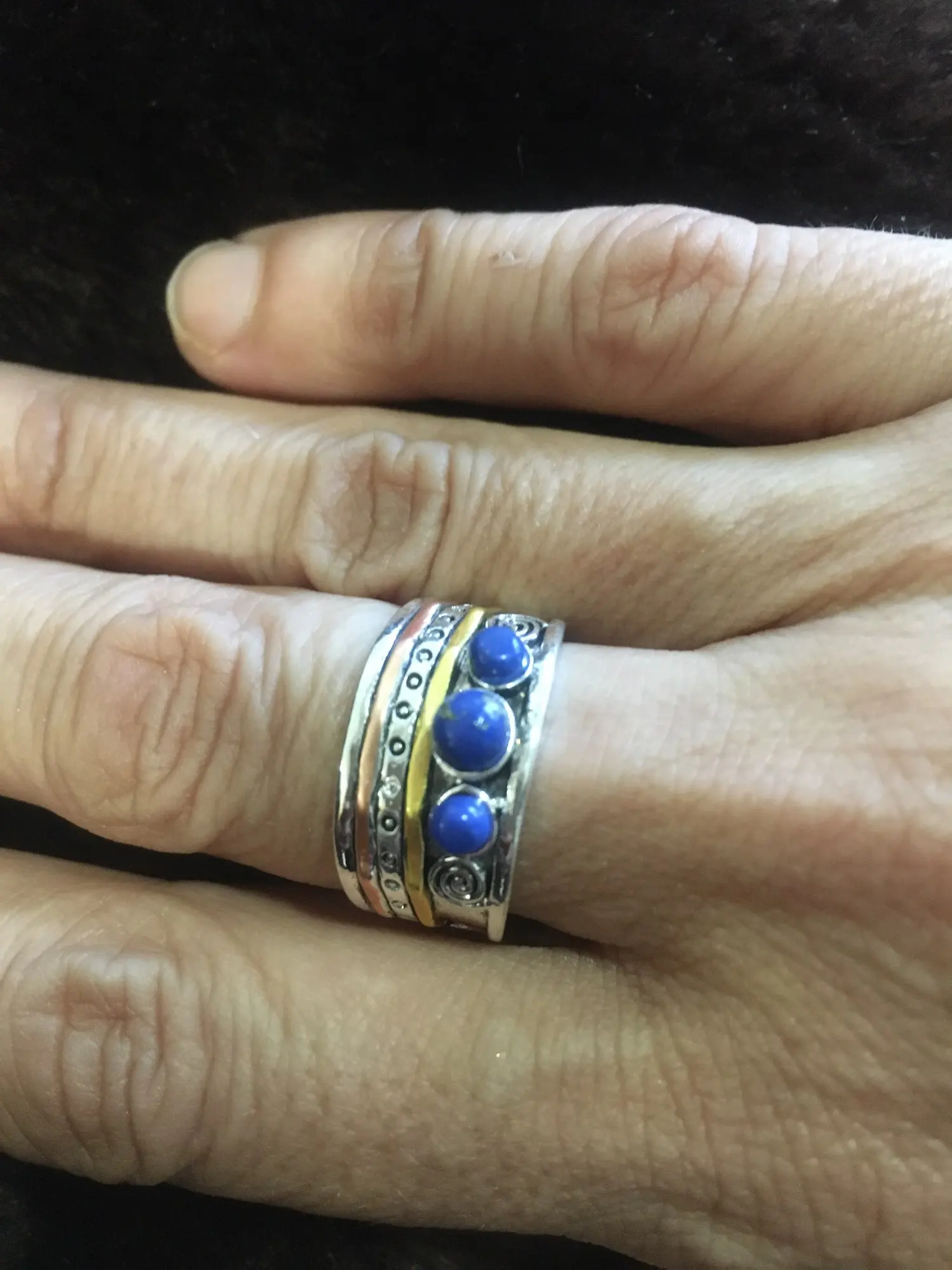 Кольцо из лазурита, трехцветное кольцо, кольцо для медитации, кольцо в стиле бохо, кольцо для тревоги, вращающееся кольцо, серебряное кольцо 925 пробы, серебряные украшения
