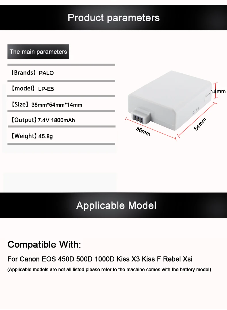 Спецификация:Модель: LP-E5Тип батареи: литий-ионныйСовместим с: для Canon EOS 450D 500D 1000D Kiss X3 Kiss F Rebel XsiНапряжение: 7,4 вЕмкость: 1800 мАчО доставкеОбычно мы отправляем товары в течение 2-3 рабочих дней после завершения оплаты. Если это день продвижения, мы отправимГруз в течение пяти дней. Как правило, после отправки Экспресс-система занимает 2-3 рабочих дня для обновления онлайн.Как правило, бесплатная доставка посылки может быть доставлена в течение 6 недель. Если вы не получили свою посылку вовремя, пожалуйста, сообщите нам, мыБудет отслеживать посылку. ОтзывыВаша удовлетворительная цель-наша конечная цель, и ваши отзывы подтолкнут нас к дальнейшей работе.Если вы удовлетворены нашей продукцией и нашим обслуживанием, пожалуйста, оставьте нам 5 звезд отзывы.Если вы не удовлетворены нашей продукцией, мы просим Вас немедленно связаться с нами, прежде чем дать нам нейтральные или негативные отзывыЧто мы можем удовлетворительно решить ваши проблемы