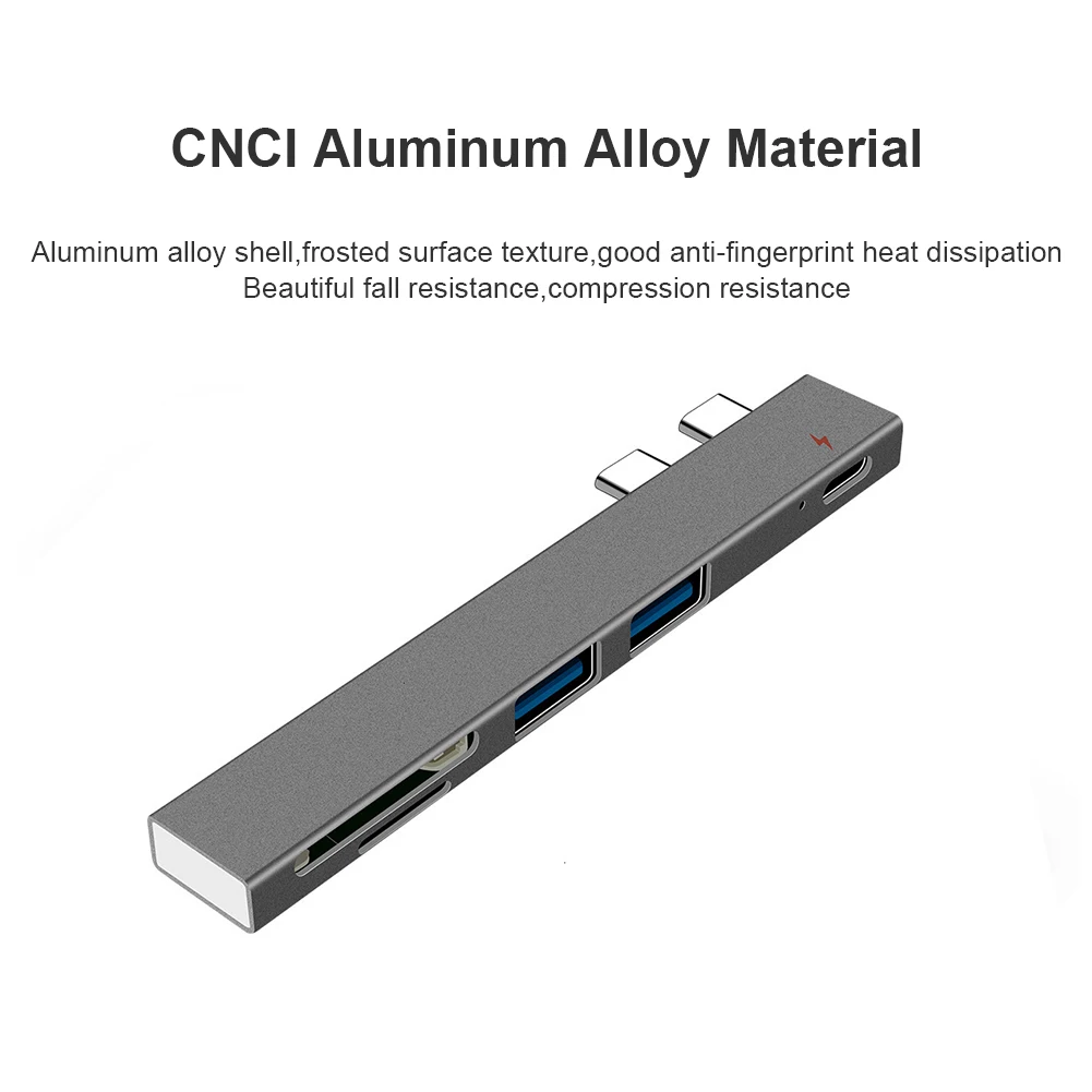 Double-head Type-C HUB is suitable for Macbook Pro, a hub that extends USB2.0 & SD/TF card reader & Type C (power supply) functions, with a unique and novel design.