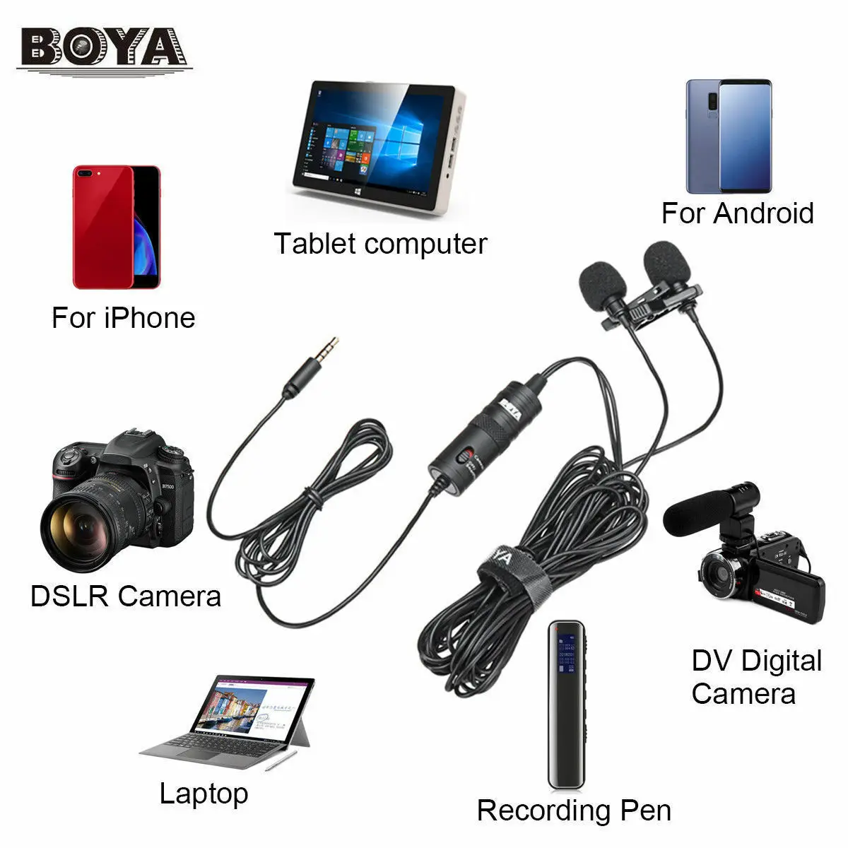 BOYA Студийный микрофон с кабелем 4 м, петличный микрофон с двумя головками и креплением на лацкане для DSLR, Canon, Nikon, IPhone, видеокамер, записывающих ПК
