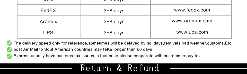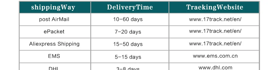 Предоставляем все виды способов доставки для разных стран. Если вы хотите указать способ доставки, пожалуйста, Оплатите стоимость доставки. Ниже дана оценка скорости доставки для справки, спасибо!