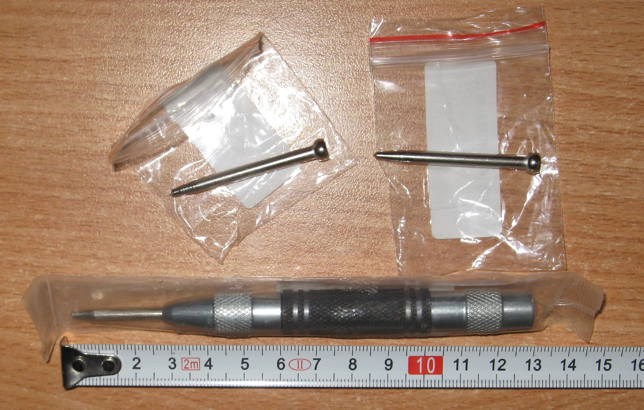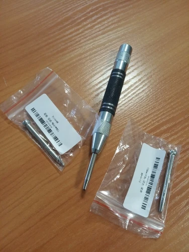 Керн-автомат + 2 дополнительных ударника. Товар соответствует описанию. Комплект с двумя запасными ударниками. С виду всё хорошо. Разметку керн делает нормально. Отметина маленькая, но видна хорошо. Купила 25 ноября 2021 по цене 260,11 руб. с бесплатной доставкой. Заказ пришел в сборной посылке, трек отслеживался. В Санкт-Петербург посылка доставлена 13 декабря 2021.