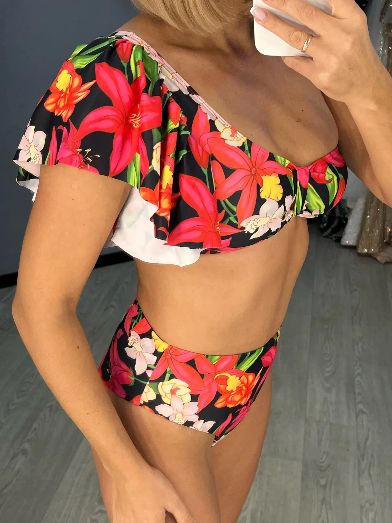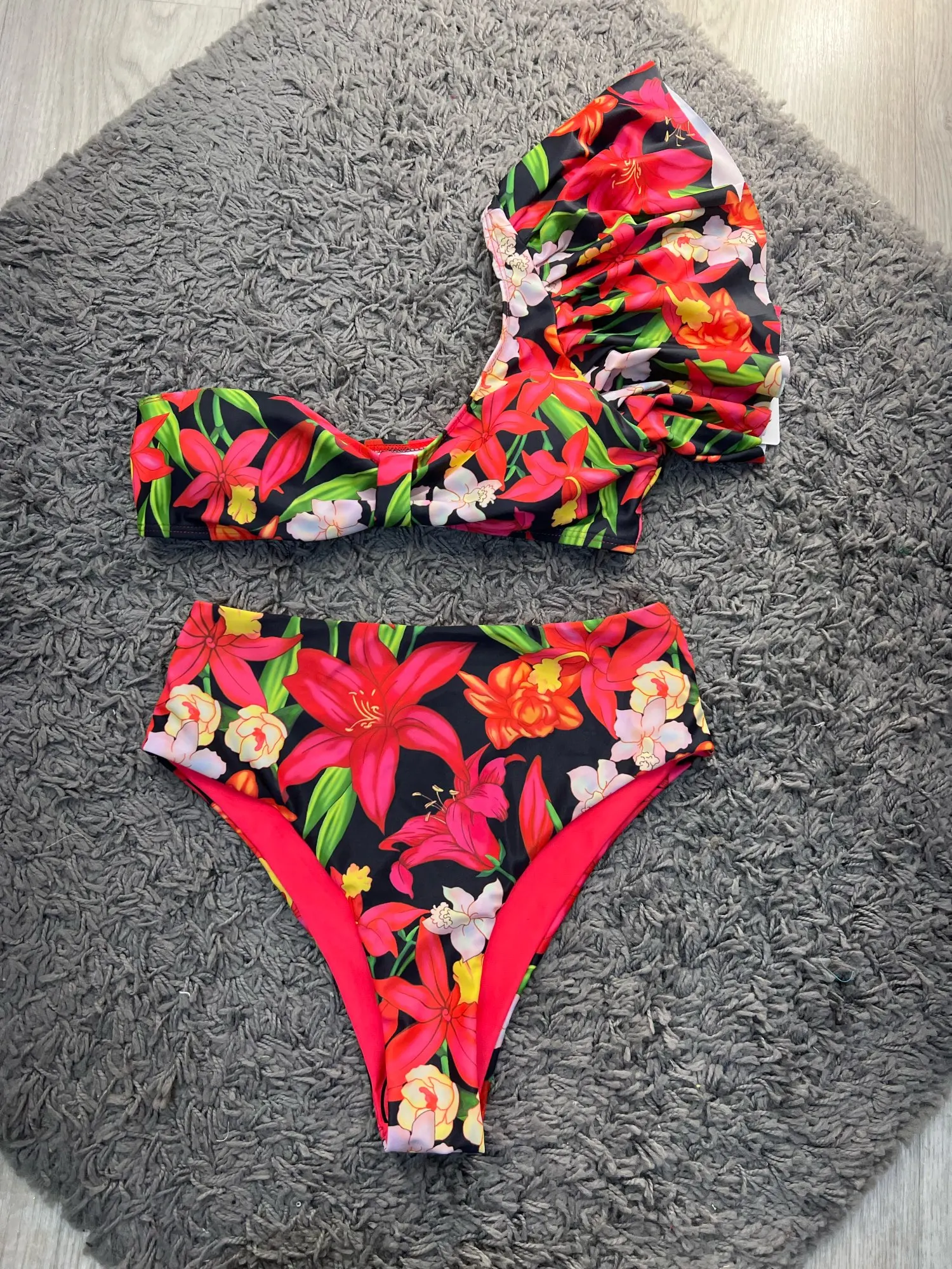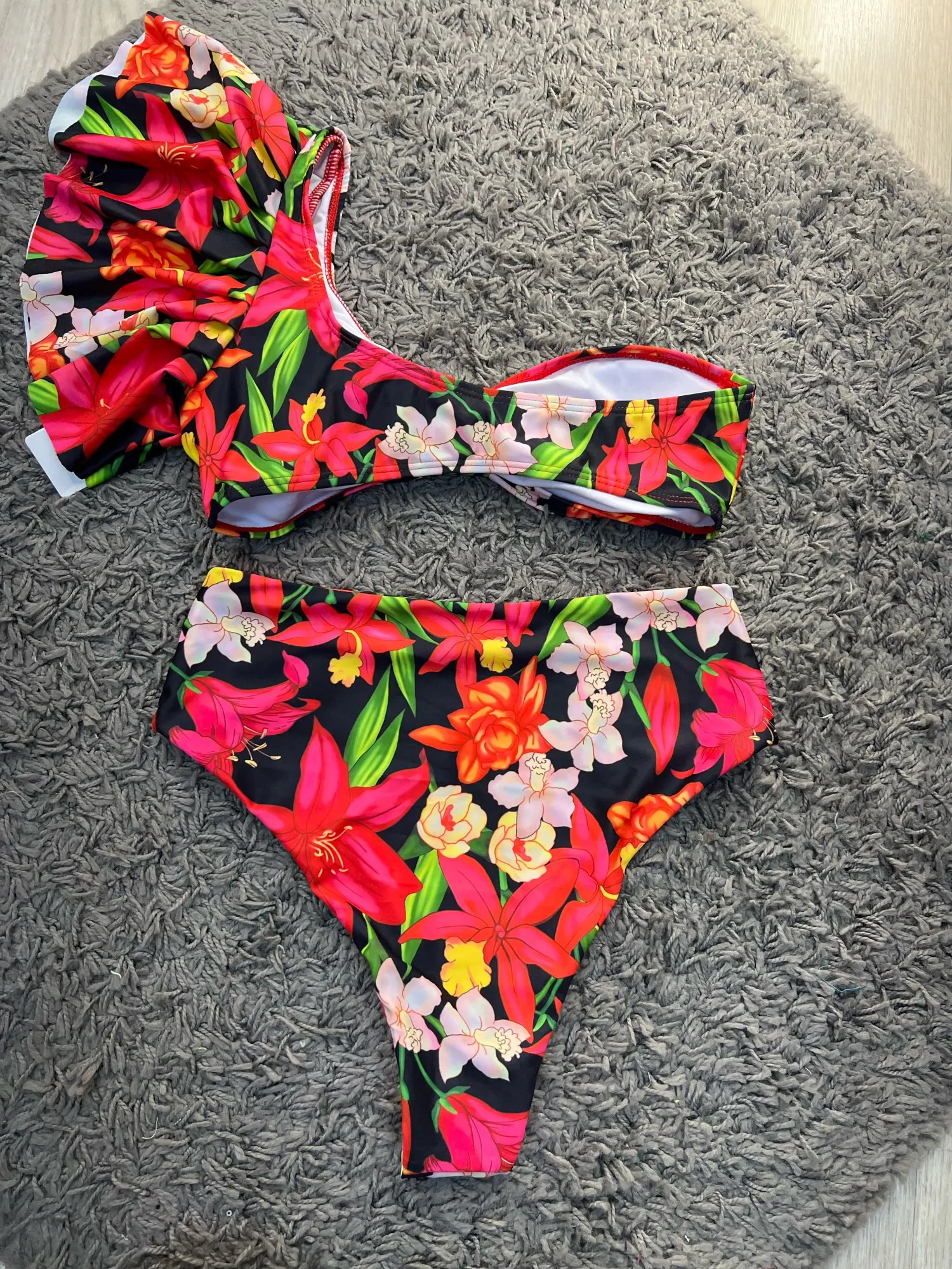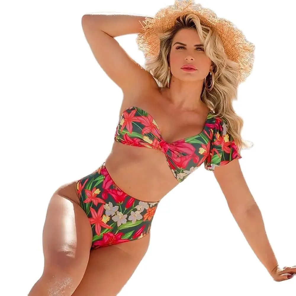 Новинка 2021 года, пикантный комплект бикини с высокой талией и оборками, купальник на одно плечо, женский купальный костюм с цветочным принтом, пляжная одежда, бикини