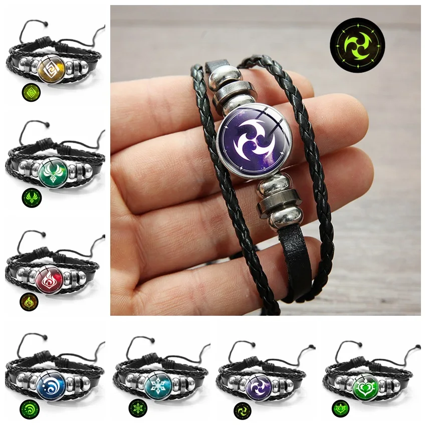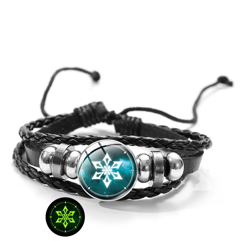 Светящийся браслет глаз Бога Genshin, товары с квадратным элементом, охватывающим время, кожаный многослойный Плетеный браслет с драгоценными камнями