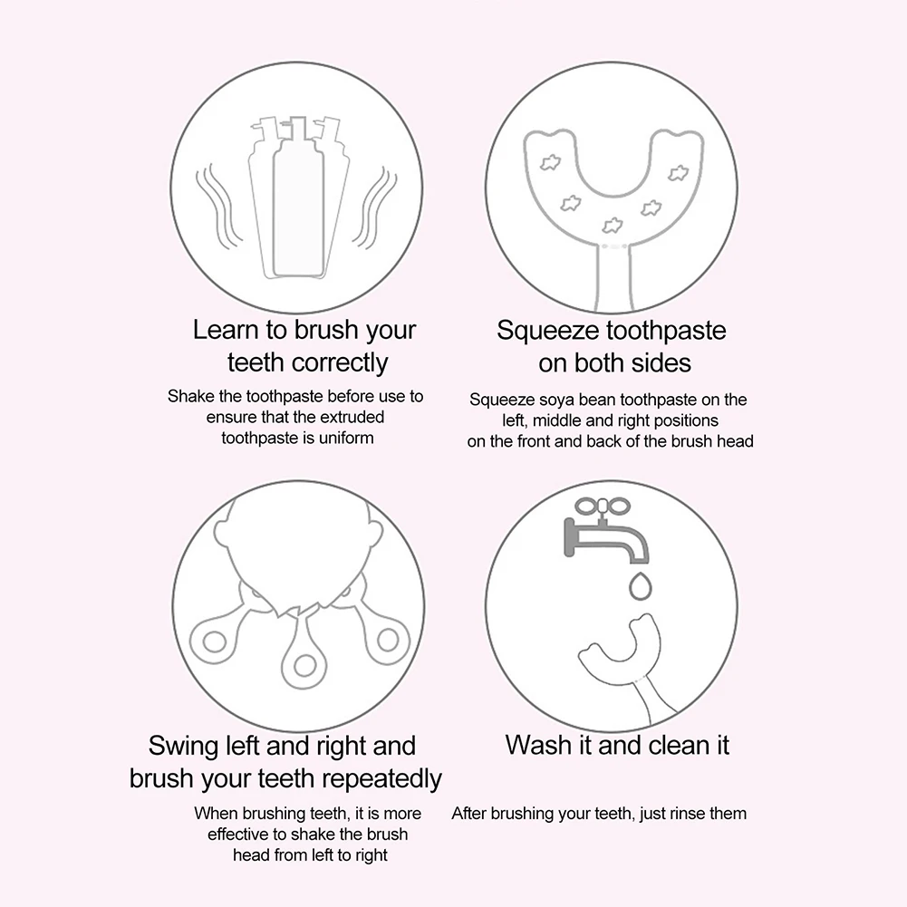 * 1. Креативная u-образная головка кисти: эргономичная u-образная головка кисти подходит для формы и механики детского рта. Предназначен для детских деликатных десен и чувствительных зубов.