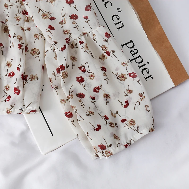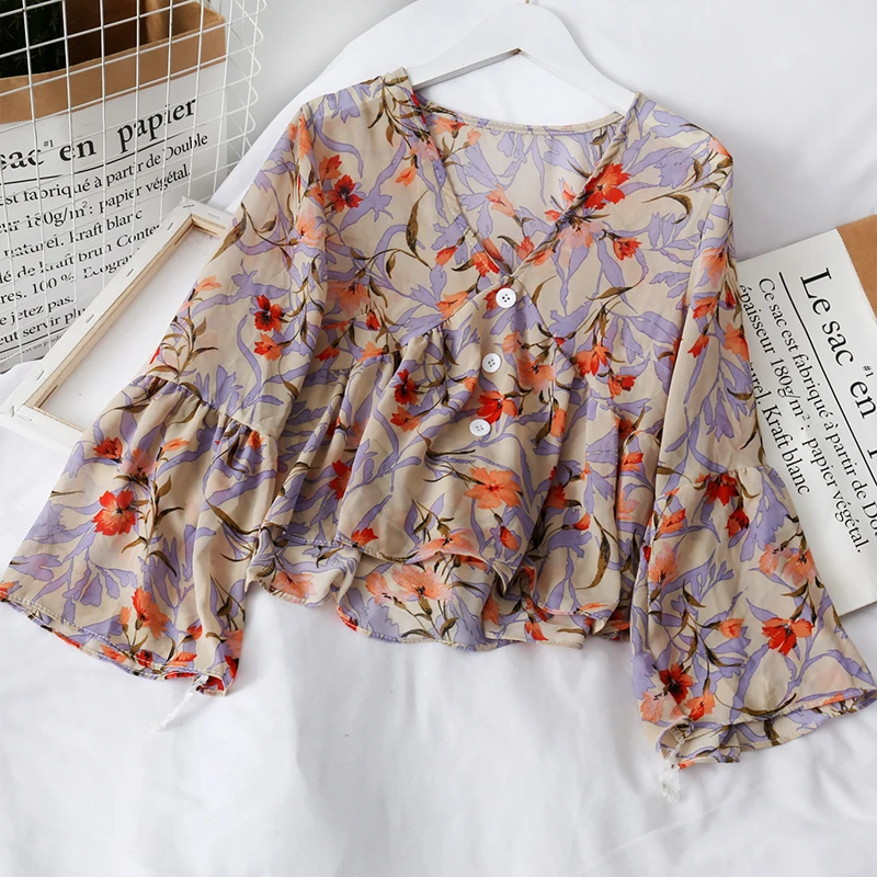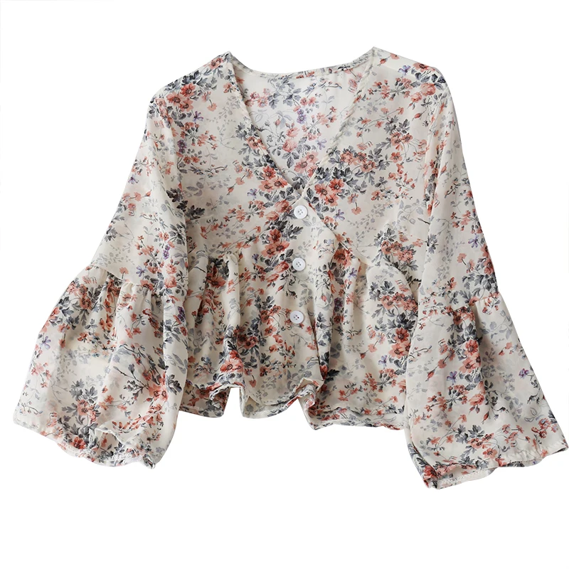 Шифоновая Блузка для женщин, женские блузки с длинным рукавом, винтажный кроп-топ, корейская мода, Цветочная женская блузка