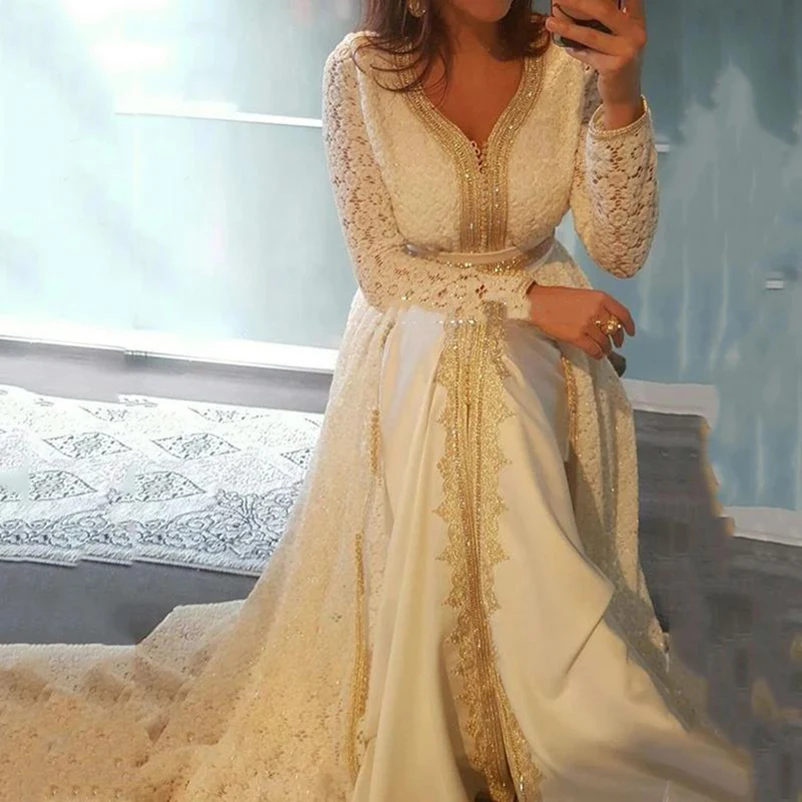 Выпускное Платье с золотистой аппликацией, цвет слоновой кости белый марокканский кафтан, вечернее платье на три четверти