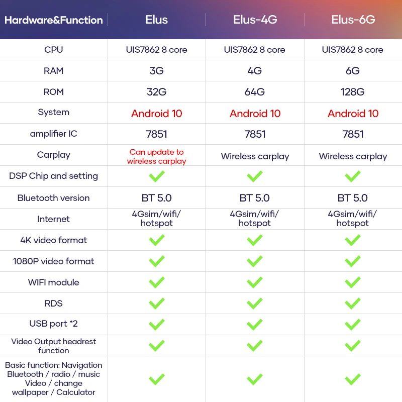 Серия ELus:ЦП: 7862 , 8 ядер,RAM 3G + ROM 32GСистема; Чистый android 10,0Встроенный в LM DSP , 32GEQ band, более эффективная Настройка звуков эквалайзера.Встроенный в форму carplay, поддержка подключения carplay через порт USB. Поддержка голосового управления siri через телефон.Поддержка 4G Lte интернет, поддержка 5G функции Wi-Fi, bluetooth до версии 5,0. Поддержка функции видеовыхода подголовника, также монитор подушки вызова.ELus-4G серии:ЦП: 7862 , 8 ядер,4G RAM + 64G ROMСистема: чистый android 10,0Встроенный DSP пресс-формы, можно установить 32 полосный настройки.Встроенный в беспроводной Carplay, поддерживает функцию carplay, с значком Z-link или T-link на пользовательском интерфейсе.Может поддерживать Голосовое управление через iphone4G LTE интернет, также встроенный WIFI модульELus-6G серии:ЦП: 7862 , 8 ядер,RAM 6G + ROM 128GСистема; Чистый android 10,0Встроенный в LM DSP , 32GEQ band, более эффективная Настройка звуков эквалайзера.Встроенный в форму carplay, поддержка подключения carplay через порт USB. Поддержка голосового управления siri через телефон.Поддержка 4G Lte интернет, поддержка 5G функции Wi-Fi, bluetooth до версии 5,0. Поддержка функции видеовыхода подголовника, также монитор подушки вызова.Формат видео: H.263,H.264,MPEG1/2,MPEG4,RMVB,AVI,WMV,3GP,MP4,MOV,MPG,DAT,VOB,MKV,FLV,TS,TP и так далее.Формат аудио: ape/flac/wma/acc/ogg/ra/wav/mp3/mp2Неразрушающая Музыка: поддержкаСпутниковый Одноместный: американский GPSBluetooth: поддержкаЗеркальная ссылка: Поддержка Andriod смартфона и iPhone,Apple CarPlay и Android Авто доступно (опционально)Установка приложения: поддержка загрузки, установки, приложения для менеджеров из APP StoreВидеорегистратор/USB ADAS DVR: высокая скорость 1080P/720P запись, управляется с помощью касания Экран блока, поддержкой ADAS системы (покидании полосы Предупреждение, warsztatowe Предупреждение, Stop & Go), В нашем наборе питания мы предлагаем USB ADAS DVR.OBD II: поддерживаетсяTPMS: поддерживает встроенные или внешние тестерыBluetooth BT Телефонная книга с контактами поиск по клавиатуре, A2DP BT МузыкаРадио: серия LX с FM,AM band. Но не RDS ,PX ,TS серии с RDS.Управление рулем: оригинальная поддержка управления рулемWallpaer/логотип: различные обои/логотипМагазин google/youtube: ПоддержкаЯзык: многоязычный, более 50 видов языка