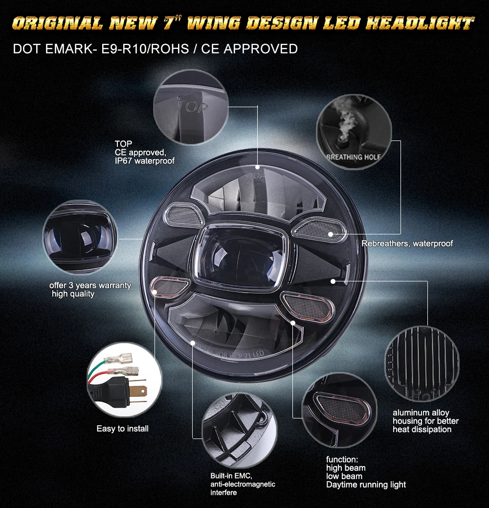 1. Изготовлен из высокая интенсивность Cree светодиодный чипы, гораздо ярче, чем оригинальные или других подобных 7 дюймов светодиодный фары для автомобиля2. Одобренный DOT гарантирует, что ваши огни являются легальными на дороге, удовлетворяя требованиям международных стандартов безопасности двигателя.3. Идеальный светильник, вырез острый и прямой, не слепить встречного движения.4. Высококачественный корпус из литого алюминия, усовершенствованная система отвода тепла.5. Новейший уникальный и красивый дизайн внешнего вида, встроенный EMC для защиты от электромагнитных помех.