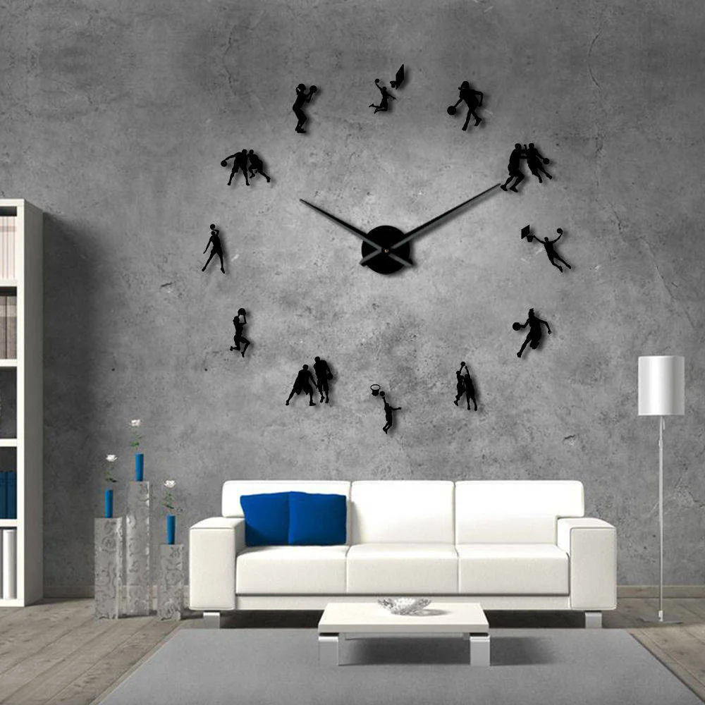 3D трехмерные акриловые зеркальные настенные часы с рисунком баскетбольной игры, съемные украшения для гостиной, настенные наклейки