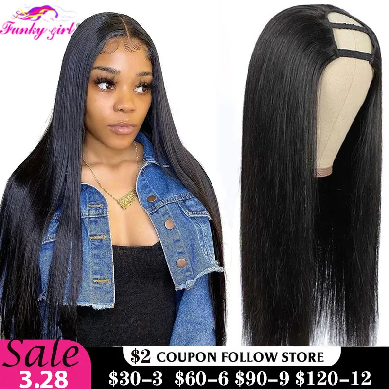Прямые парики, дешевый парик с U-образной частью, бразильские парики из человеческих волос для женщин, волосы без повреждений и клея, средний U-образный парик, плотность 180%, оптовая продажа
