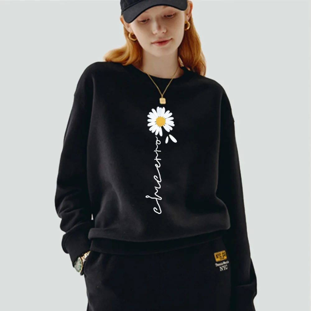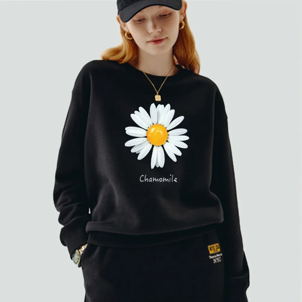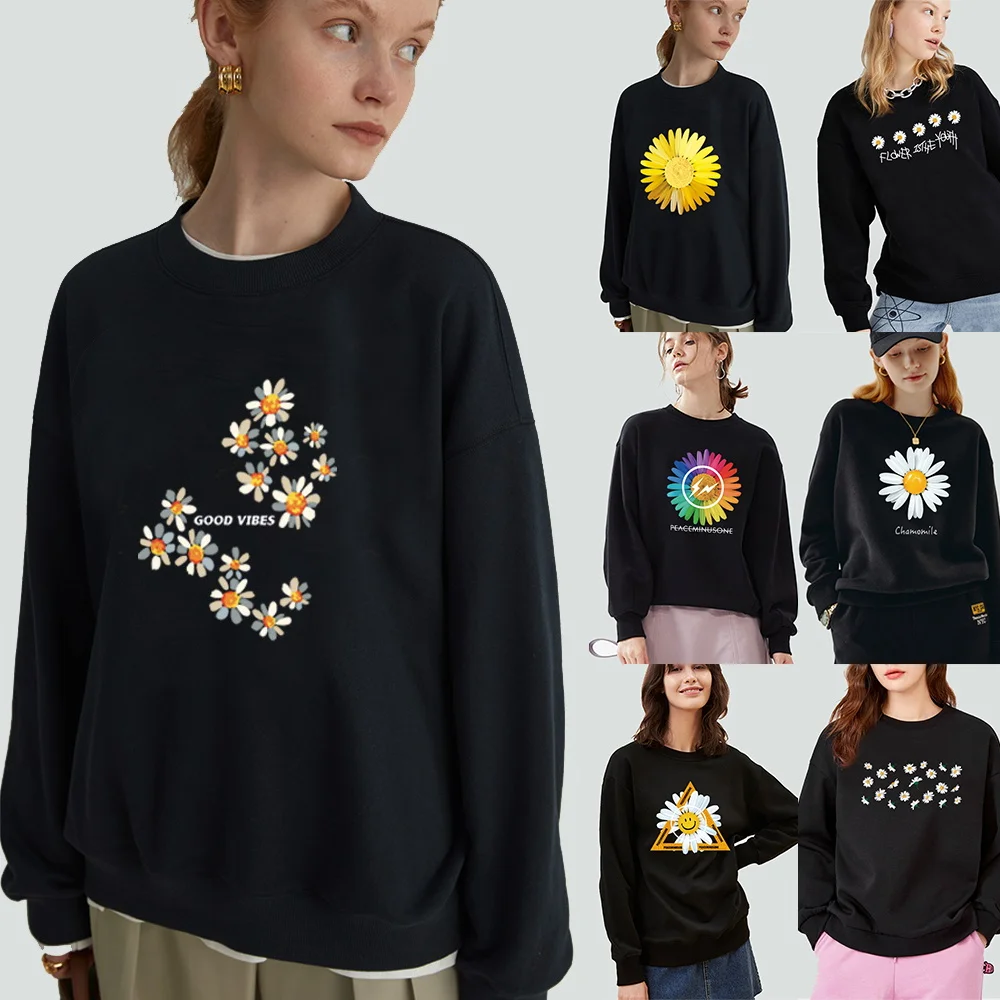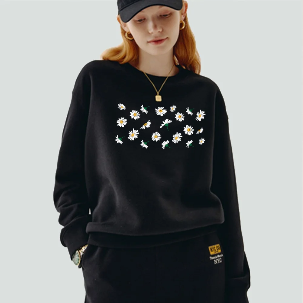 Женская одежда, пуловер, повседневный свитшот с длинным рукавом, облегающая классическая черная толстовка из полиэстера с круглым вырезом и принтом маргариток
