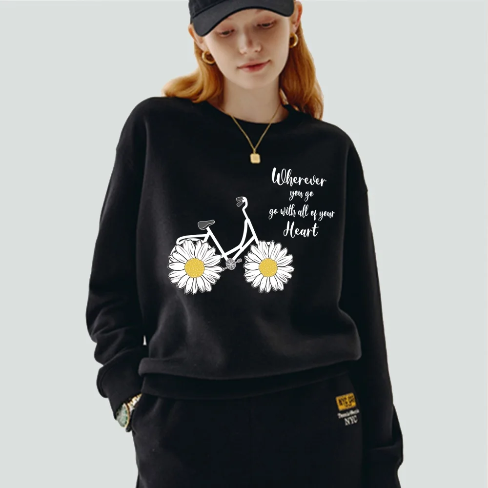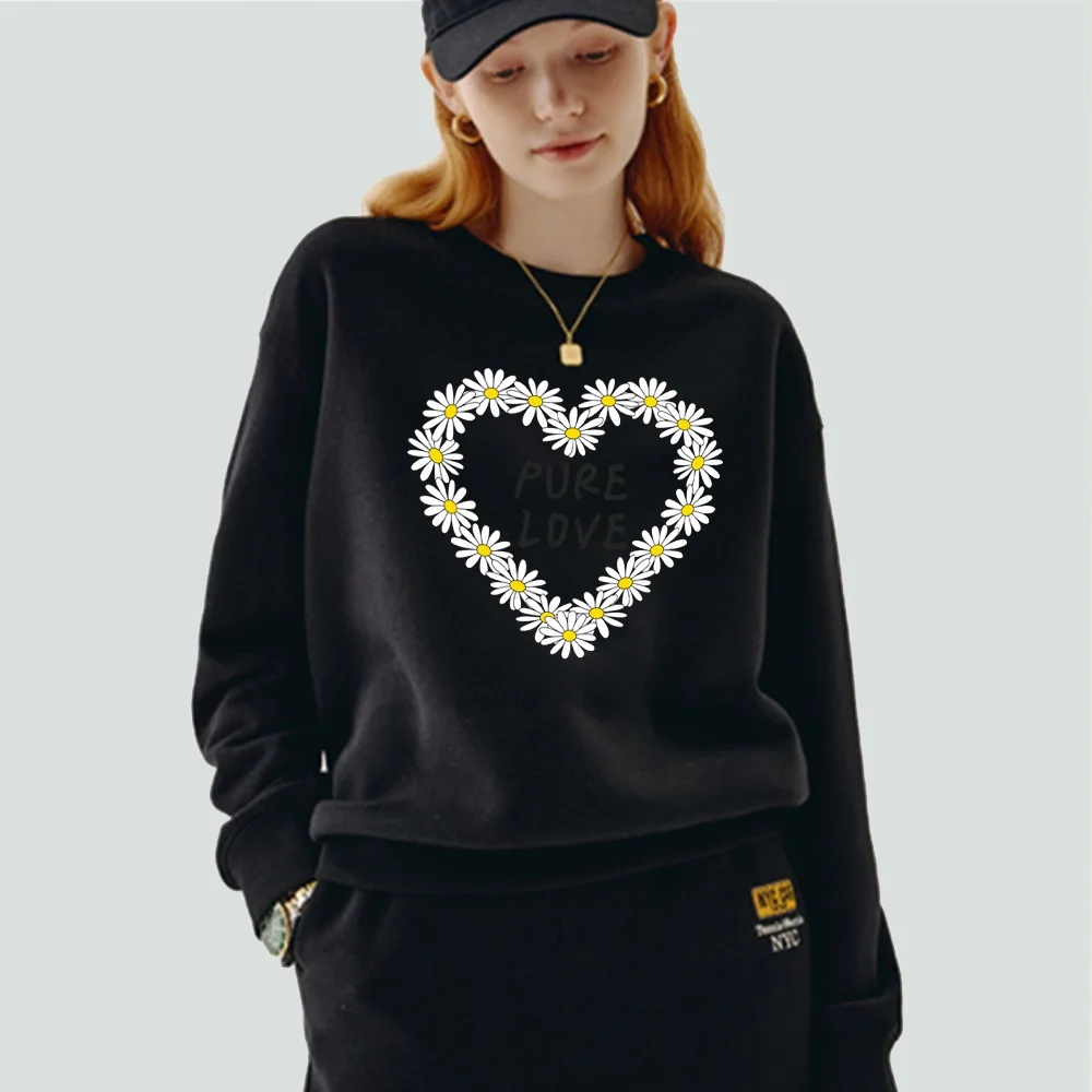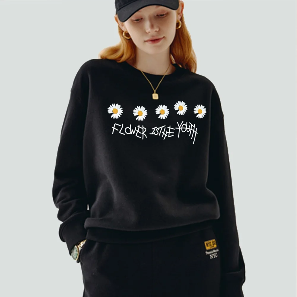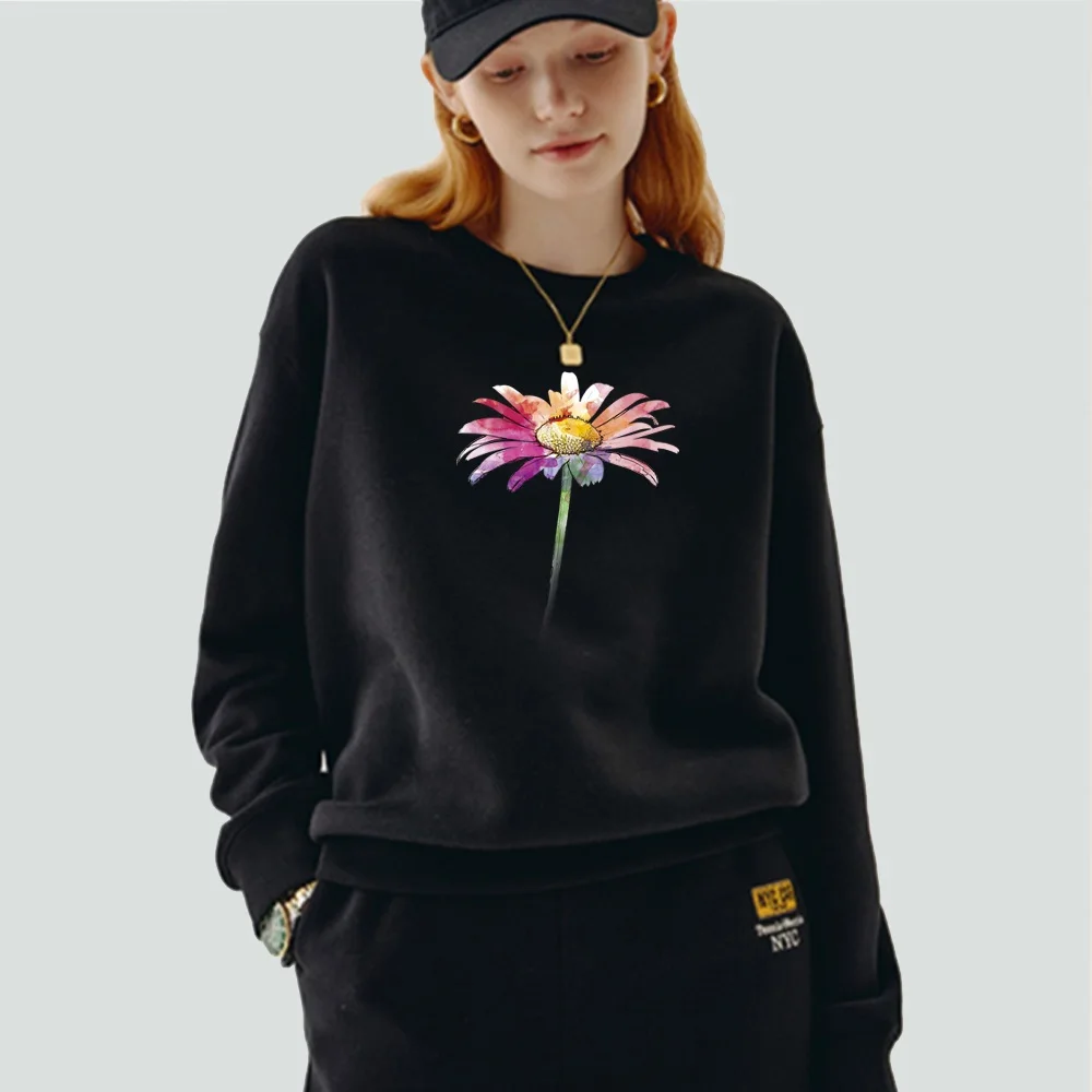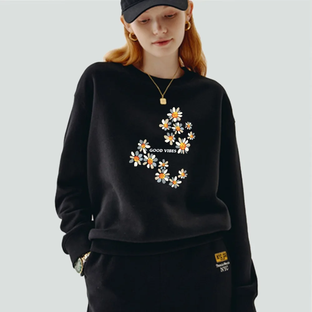 Женская одежда, пуловер, повседневный свитшот с длинным рукавом, облегающая классическая черная толстовка из полиэстера с круглым вырезом и принтом маргариток