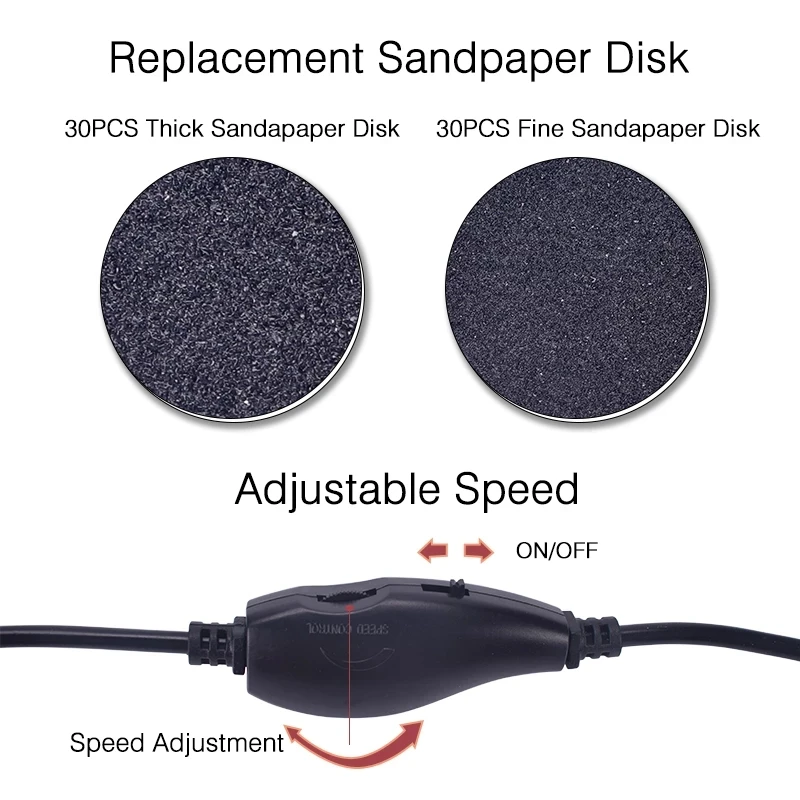 1. Вращение на 360 градусов для удаления сухости пятки ног, омертвевшей кожи, мозолей.2. Легко управлять своей скоростью по вашему запросу, быстро или медленно, более удобно.3. С заменой бумажного диска, один человек один диск, более 4. Здоровый и гигиенический.4. Маленький размер, легко носить с собой, когда вы находитесь в путешествиях или отпуске.5. Безопасное и быстрое удаление, идеально подходит для маникюрного салона семейного использования.