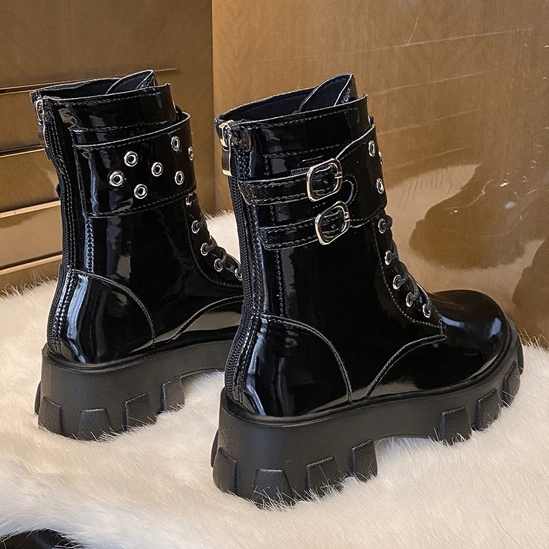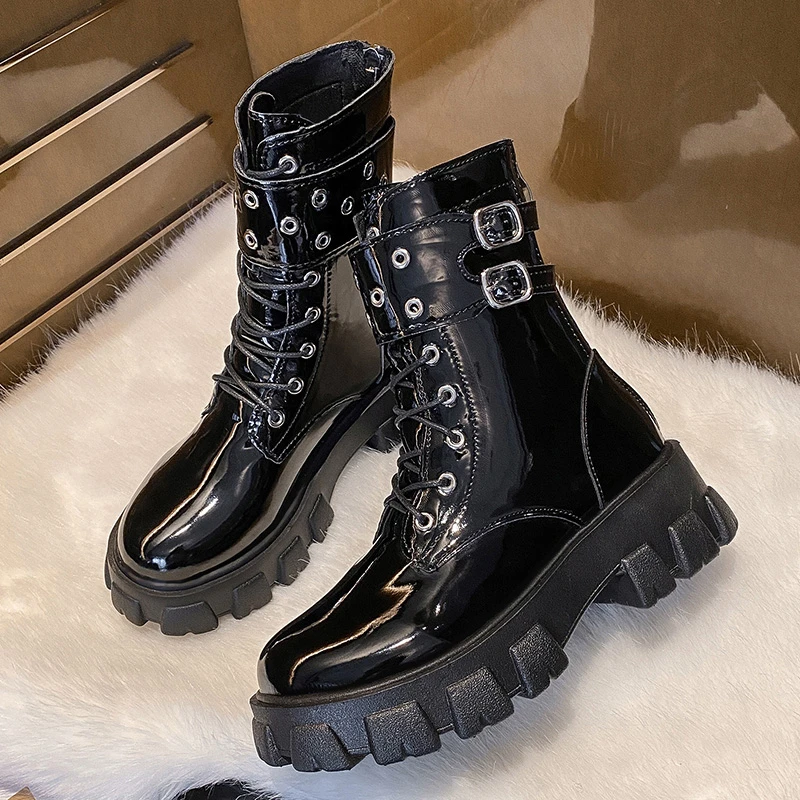 Женские ботинки с пряжкой, Черные ботильоны на платформе, на шнуров...
