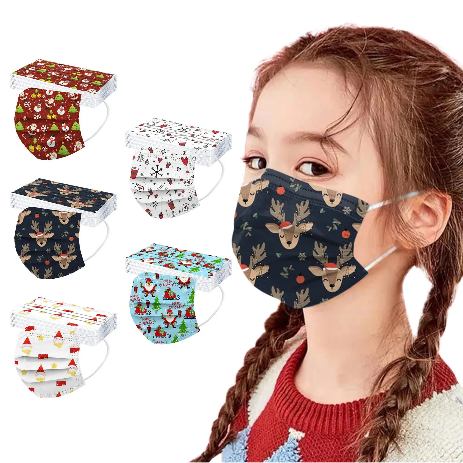 Рождественские одноразовые маски для лица для детей на зиму, 3 слоя, милый узор, маска для лица, полная защита лица