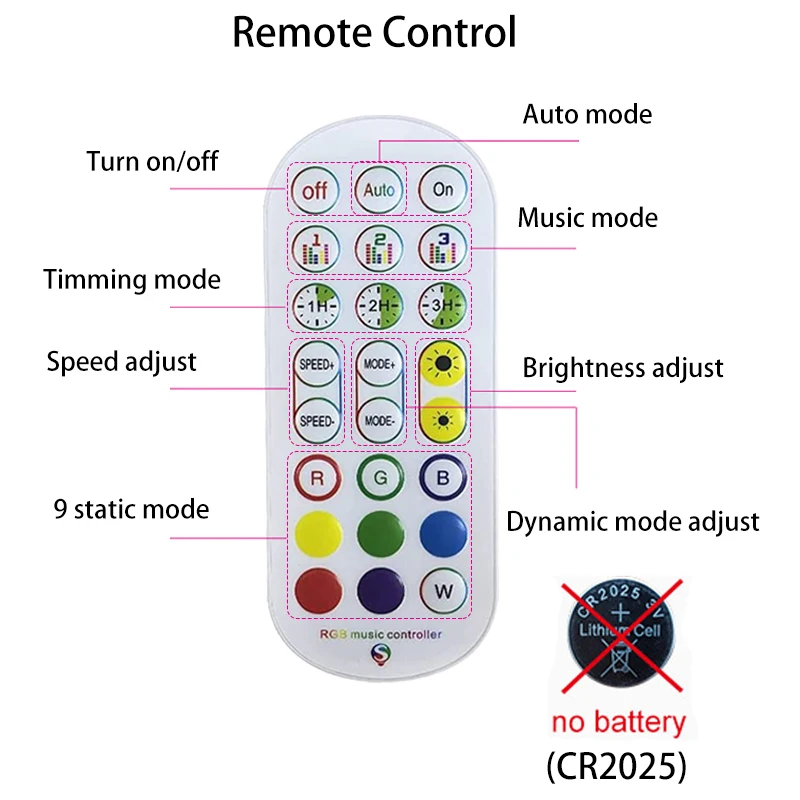 Режим 1: 16 миллионов цветовРежим 2: режим динамического освещенияРежим 3: музыкальный режимРежим 4: режим micРежим 5: таймер для включения/выключения
