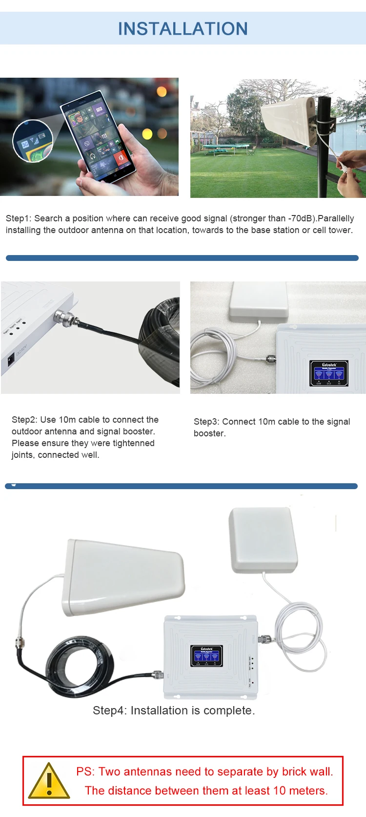 Пожалуйста, убедитесь, что вы можете получить least2 бар 900 МГц/1800 МГц (полоса 3) /2100 МГц (полоса 1) сигнал outdoorage перед покупкой, в противном случае этот продукт не может вам помочь. Для улучшения сигнала в помещении необходим хороший внешний сигнал.