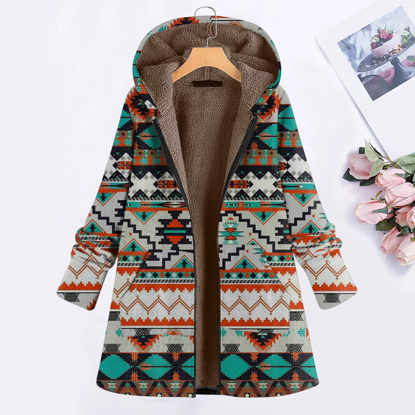 Женское флисовое пальто с капюшоном, винтажное теплое длинное пальто с карманами и принтом, свободная верхняя одежда, зима 2021