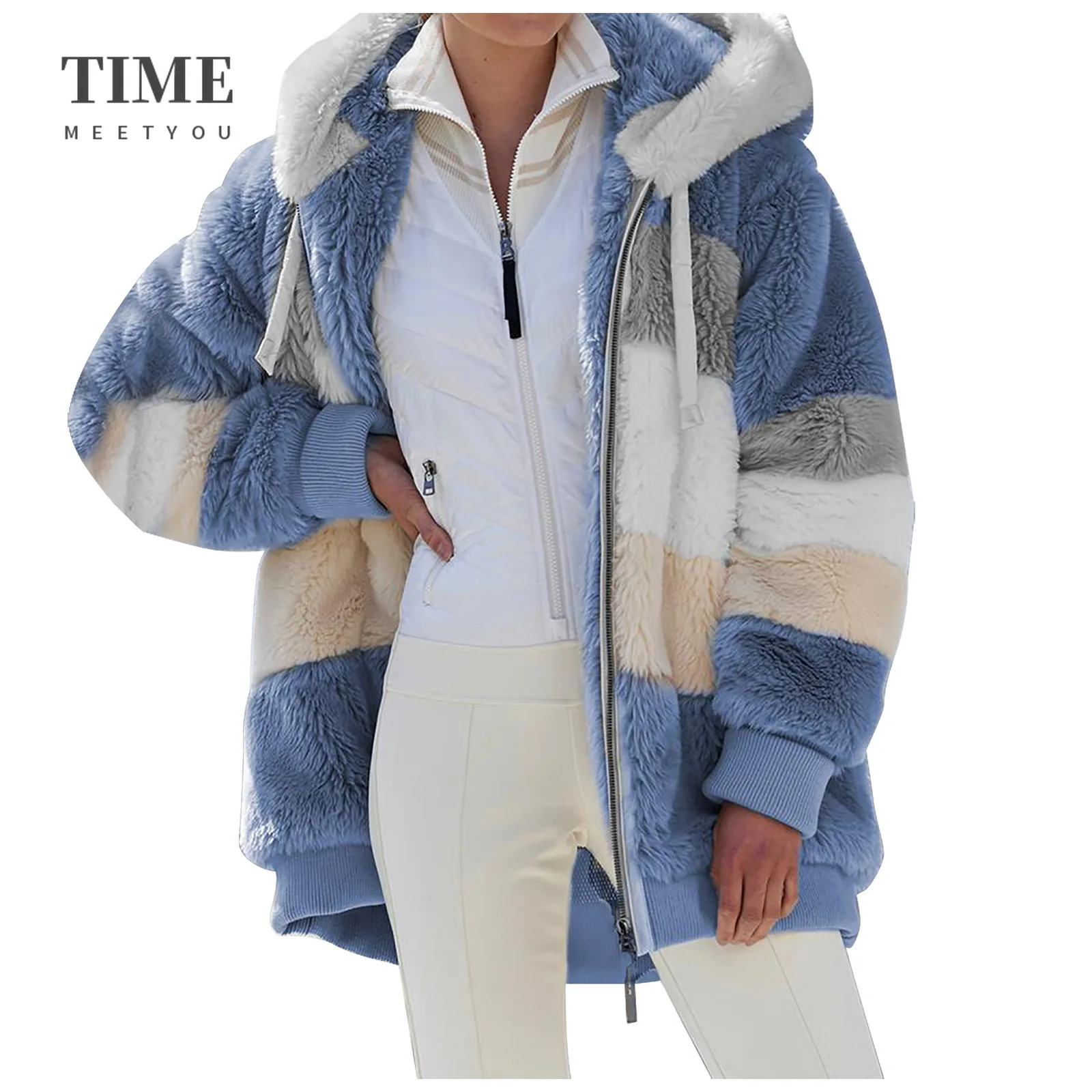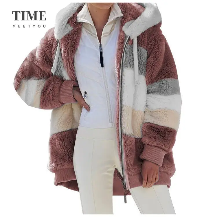Модная женская зимняя свободная плюшевая разноцветная куртка с капюшоном, женское кашемировое теплое пальто с мехом, удобное уличное пальто в полоску