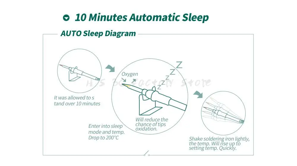 4,10 минут фиксированной функции сна, до 10 минут без использования утюга, автоматически входит в режим сна, энергия и продлить срок службы наконечника.