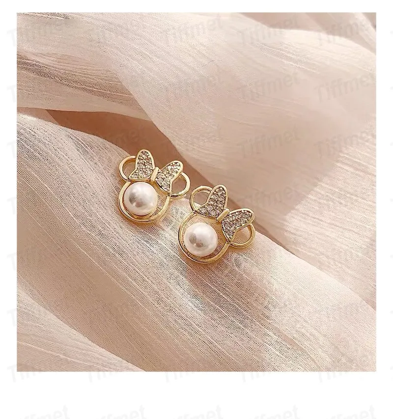 Серьги-гвоздики с милым бантом, модные серьги с бисером, романтичные серьги с мультяшным рисунком мыши, кристаллами и жемчугом, 2022, модные классические женские ювелирные изделия оптом