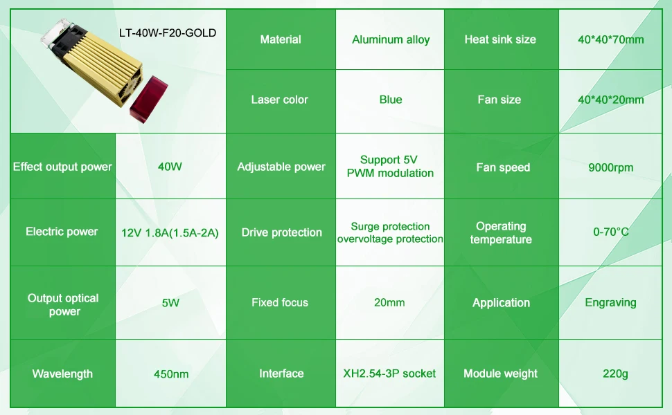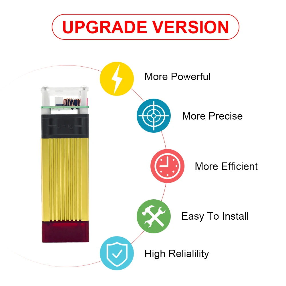 [Прост в использовании]Длина волны: 450нм, Вход: 12 В постоянного тока 2.5A, Регулировка мощности: Поддержка модуляции шим 5 В, входной порт: XH2.54-3P разъем, метод установки линии управления: подключаемый. Регулируемая лазерная головка, легко регулируется, подходит для гравировального Станка DIY.