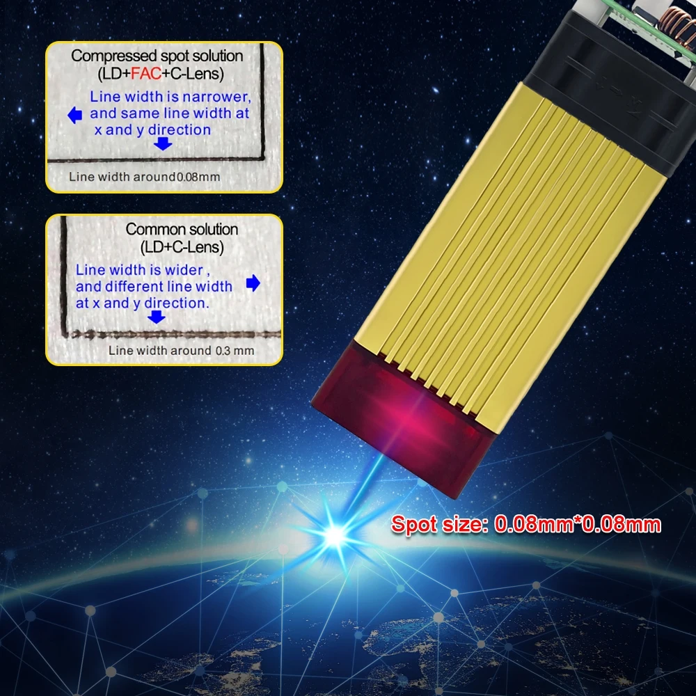 Синий лазерный модуль --- профессиональная лазерная головка с высокой скоростью и высокой стабильностью. Яркий синий светильник, легко найти при резке.