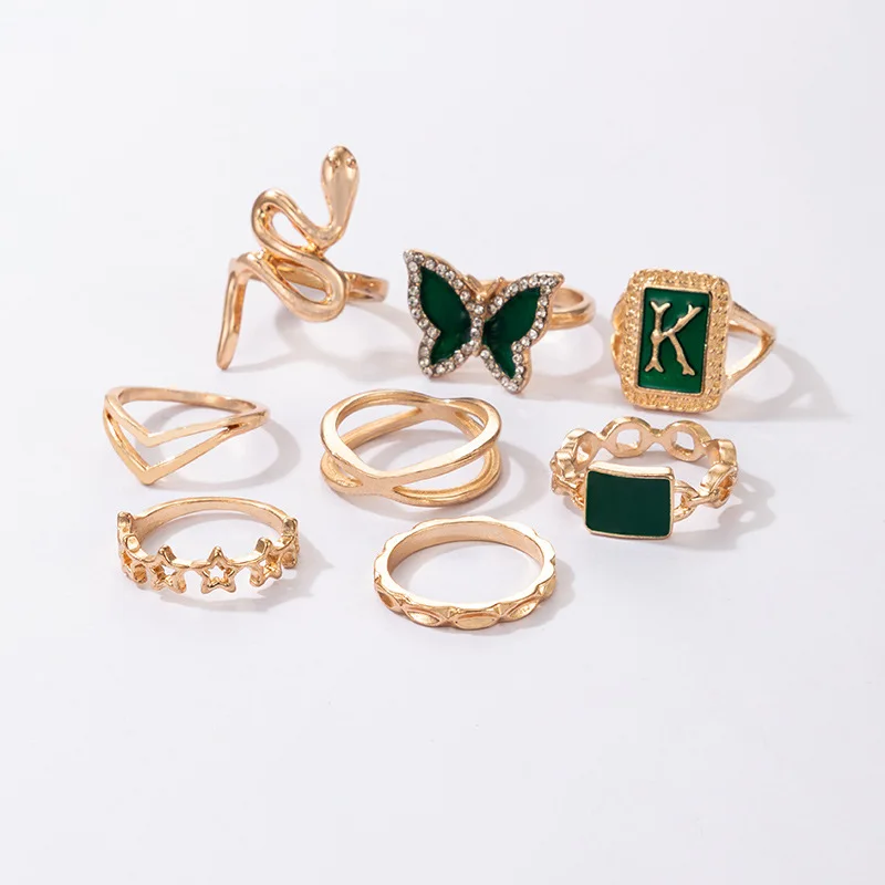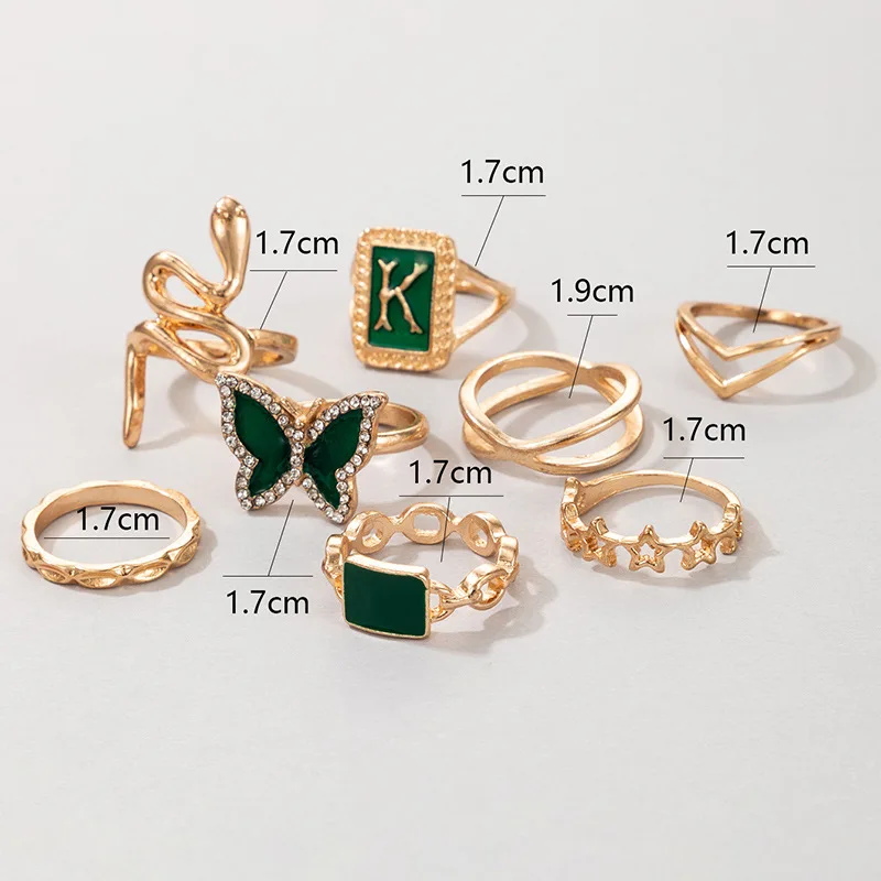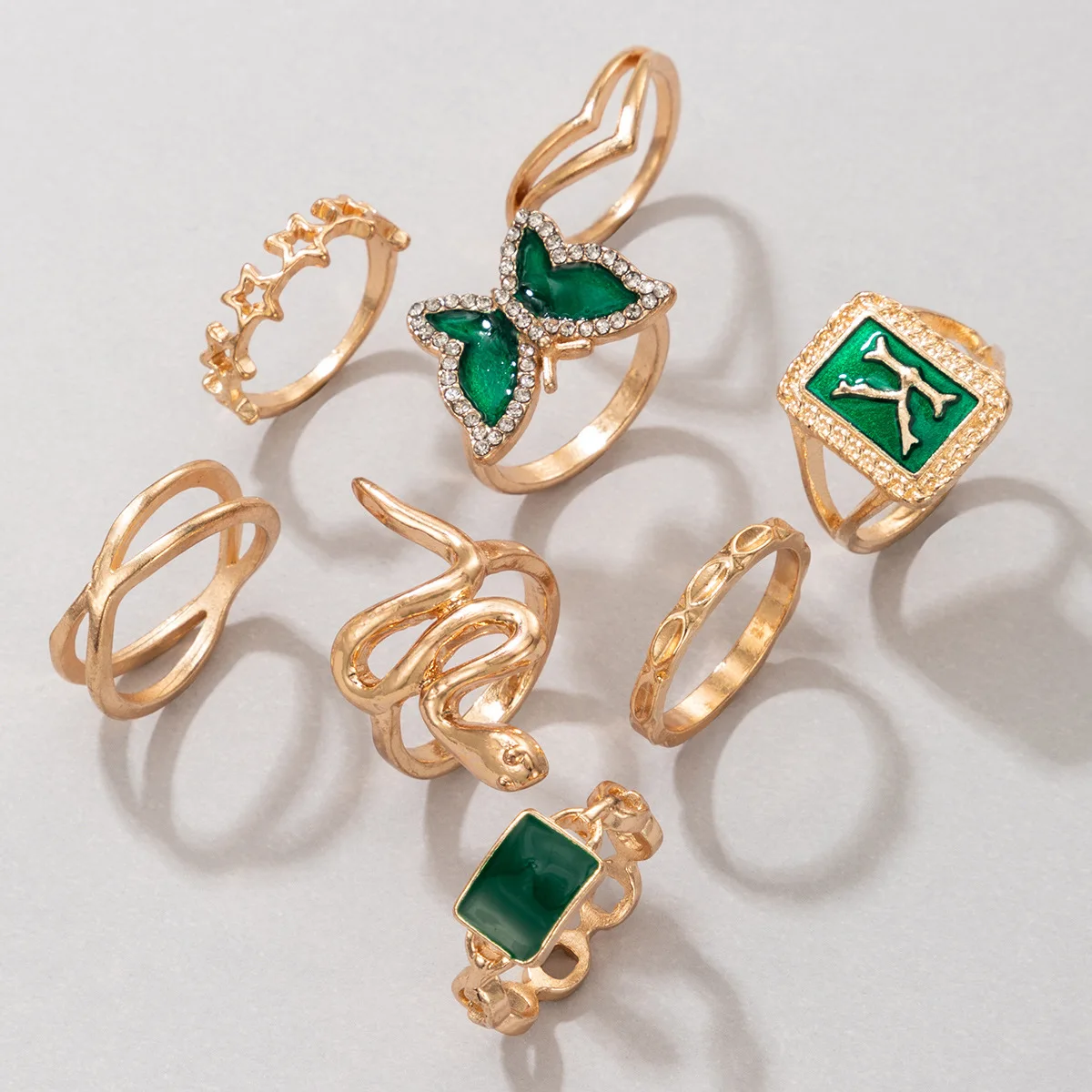 8 шт./компл., богемные кольца с буквенным принтом в виде бабочек и звезд для женщин, золотистого цвета, геометрические, полые, Роскошные, с кристаллами, кольцо на палец в виде змеи, ювелирное изделие