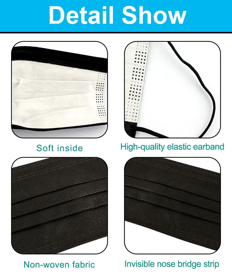 Параметры продукта:Материал: трехслойный нетканый материалПодходящий сезон: Весна, Осень, Зима, ЛетоЦвет: черныйСтиль маски: тип ушной петлиРазмеры: около 17*9,5 смОсобенности продукта:1. Новая ткань PP Нетканая ткань, мягкая и чистая, удобная и дышащая2. Процесс бесшовной вязки3. Три раза дизайн, больше дышащего пространства на лице4. Пластиковая полоска для носа, алюминиево-пластиковая полоска для носа,5. Многослойная защита для вашего дыхательного здоровья