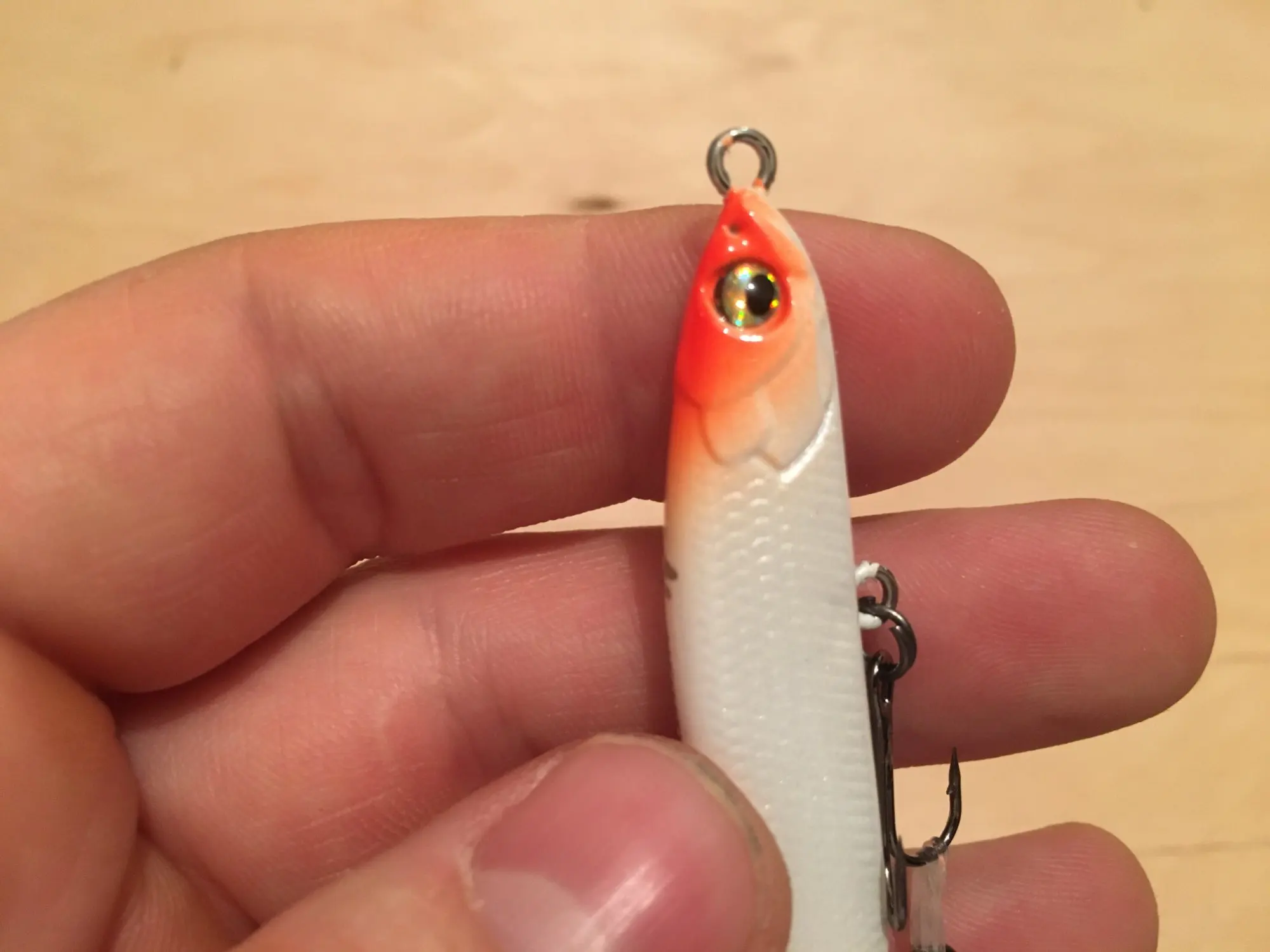 Неплохой пилькер. Качество изготовления хорошее. Покрашен хорошо. Сверху покрыт глянцевым лаком. Крючки довольно острые. Длина: 75 мм (вместе с петлёй); Вес: 7.1 г. Тонет быстро. При падении хорошо колеблется. В ультрафиолете хорошо светится оранжевая краска.