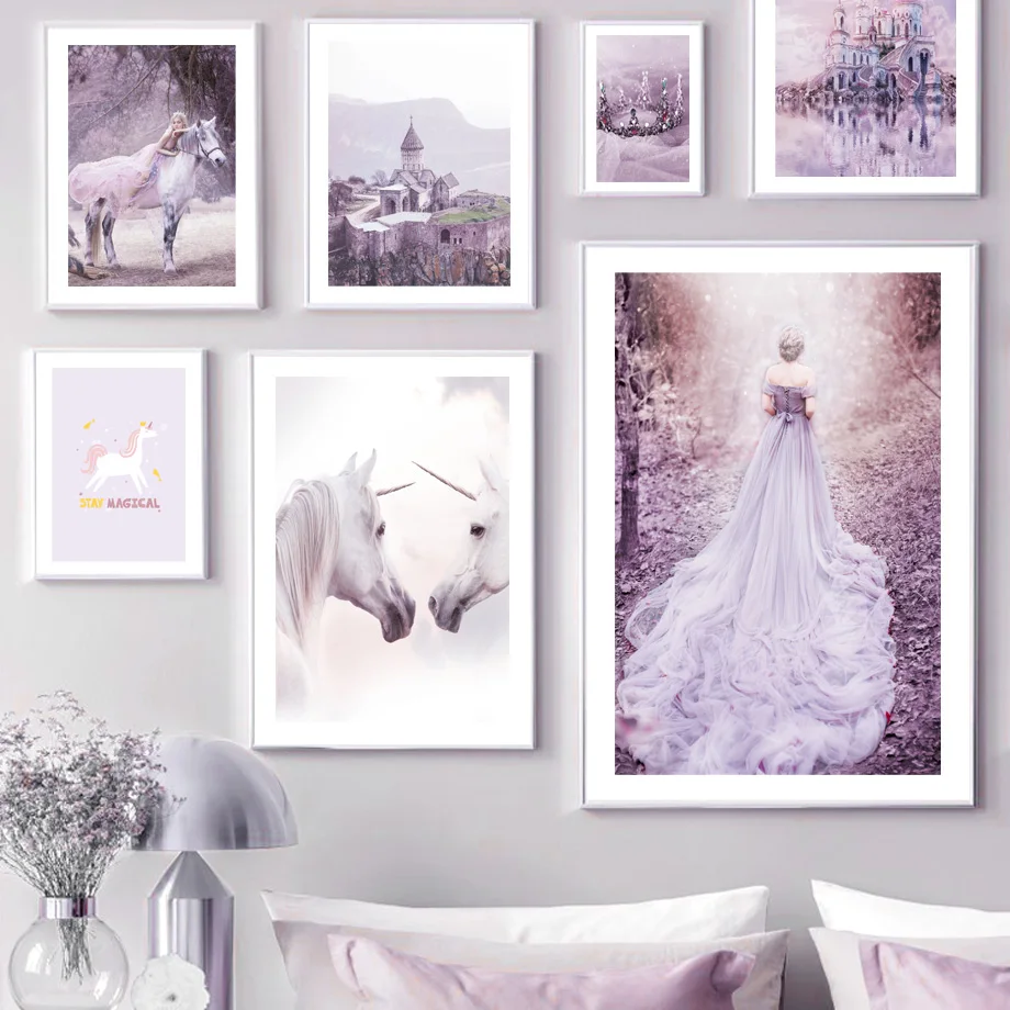 Сказочный замок Единорог Принцесса Корона фиолетовая настенная Художественная печать холст картина скандинавский плакат Настенные фотографии для девочек декор для детской комнаты