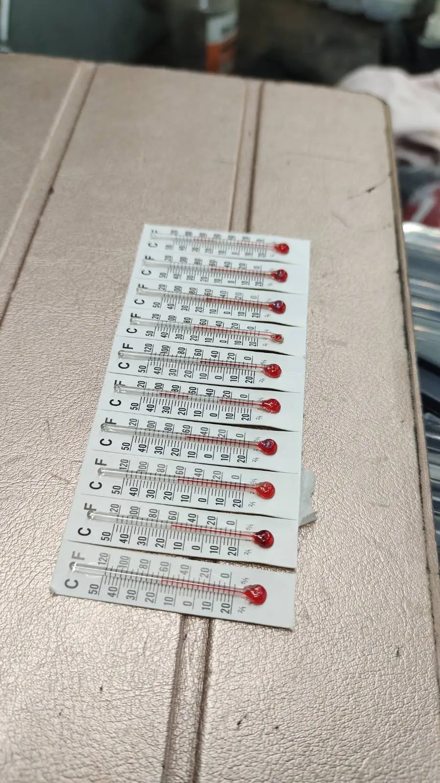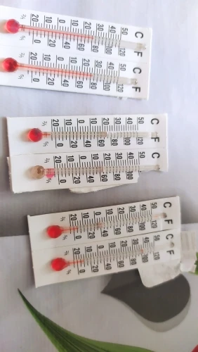 4 штуки испорчены, разрыв столбика в трубке. Остальные показывают с точностью 1-2 градуса разную температуру. 2 сильно большую градусов на 5.