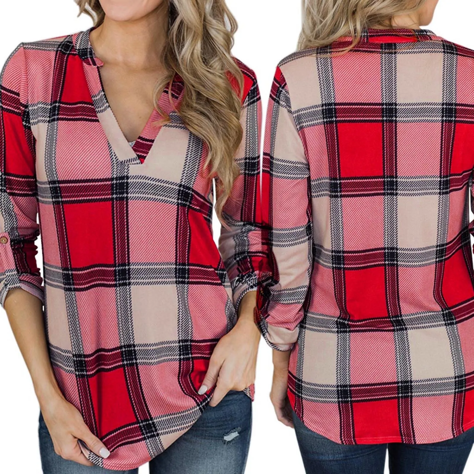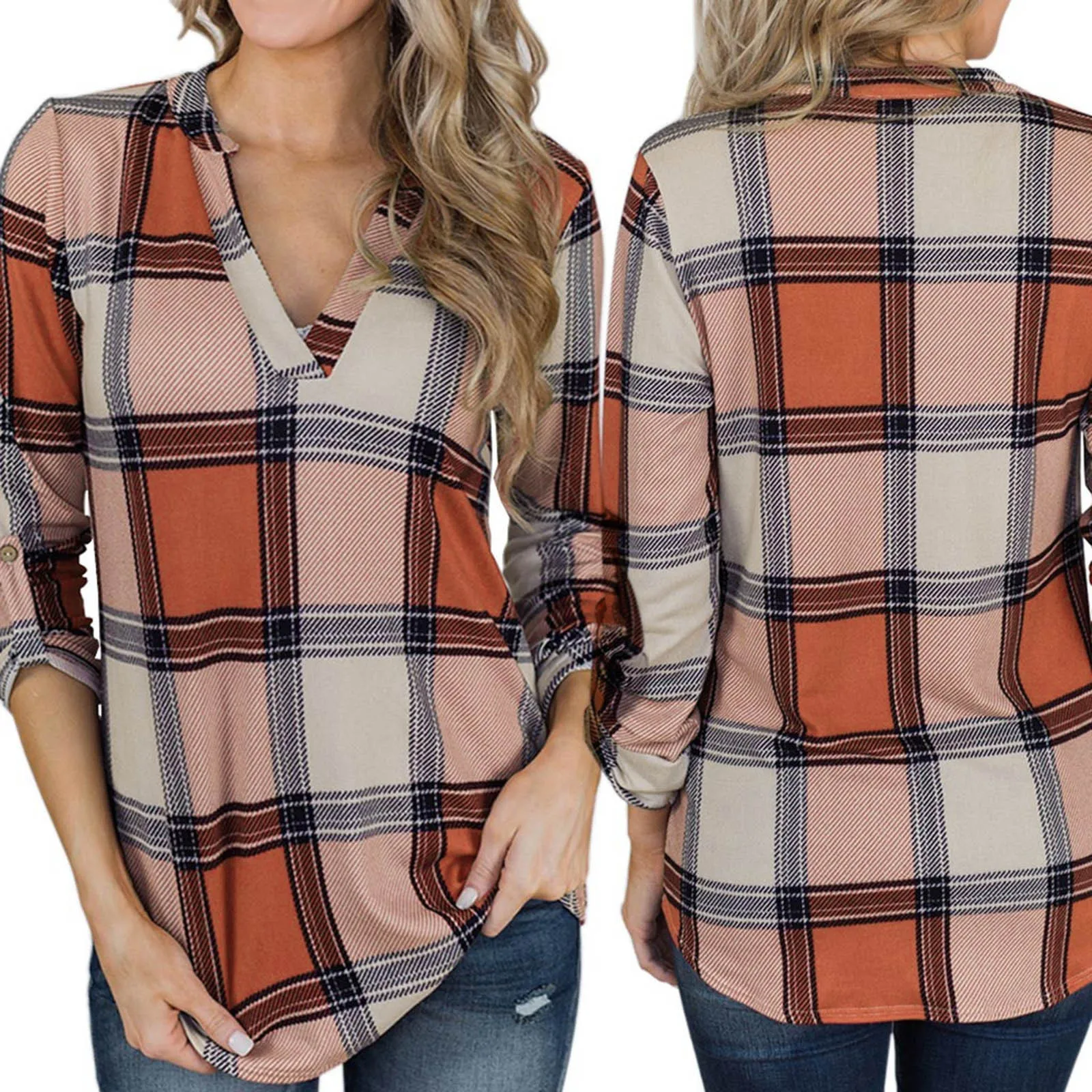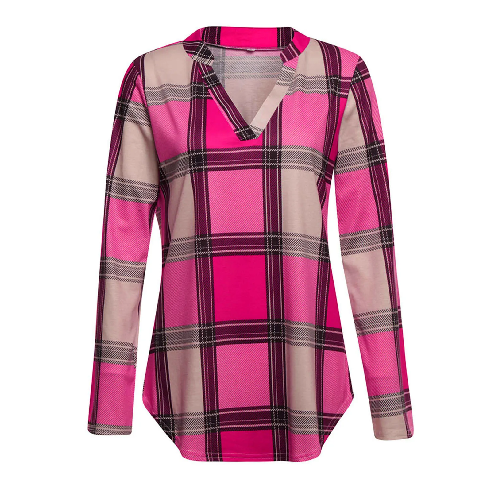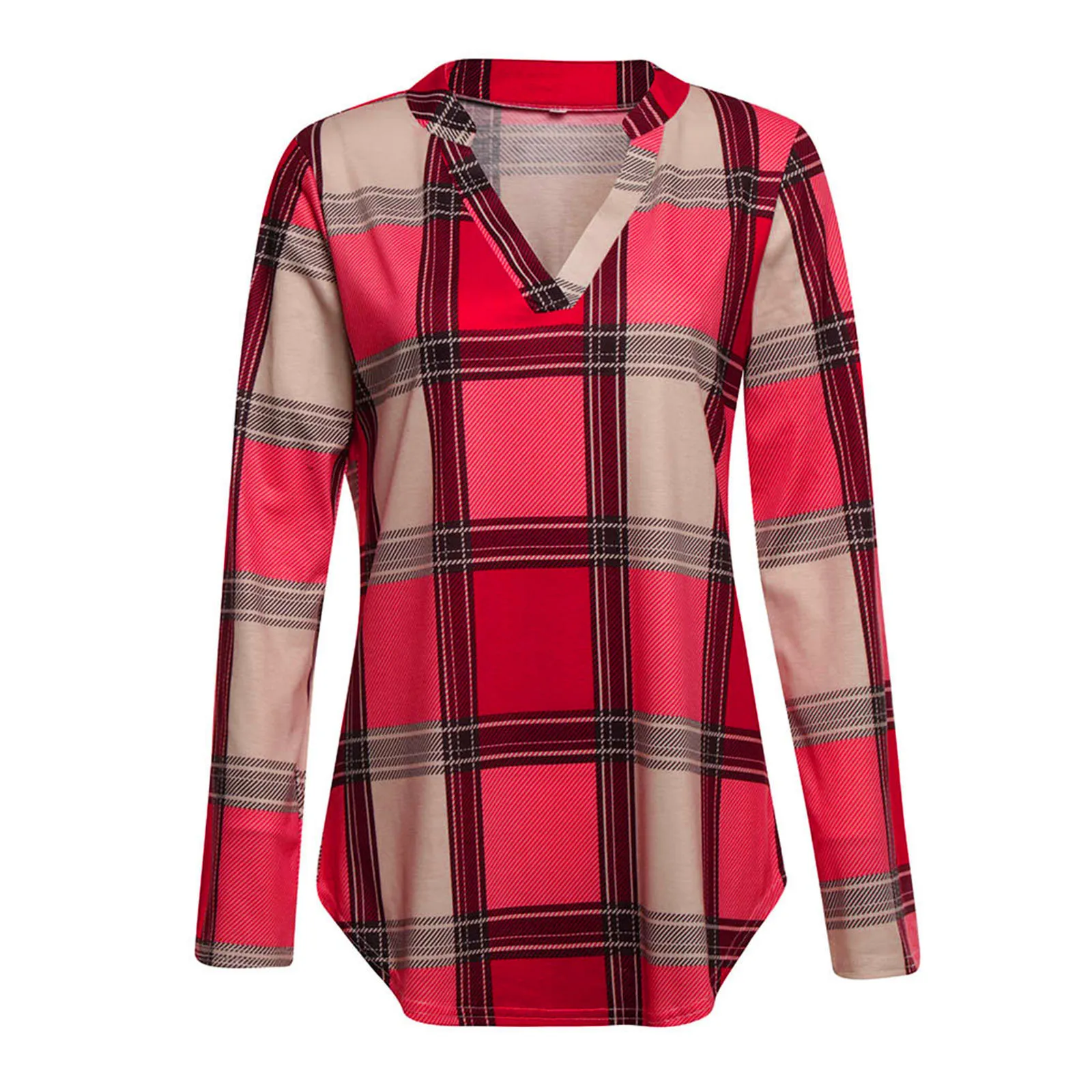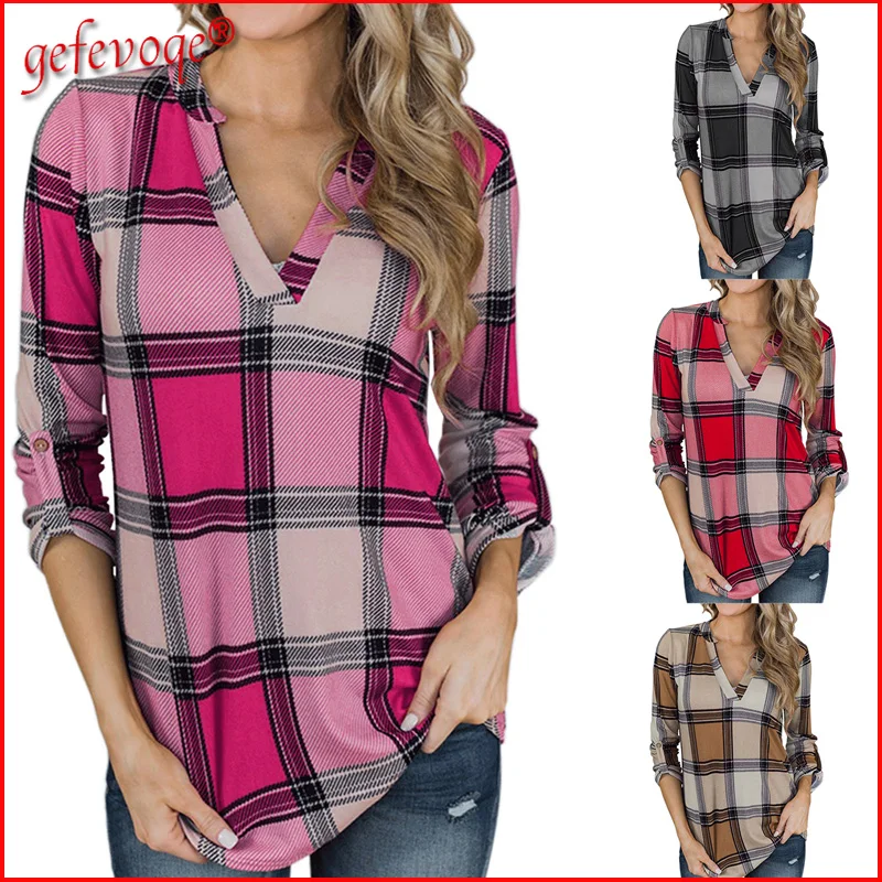 Женская Повседневная Туника с длинным рукавом, свободная Винтажная футболка в клетку с V-образным вырезом и принтом, большие размеры, осень 2021
