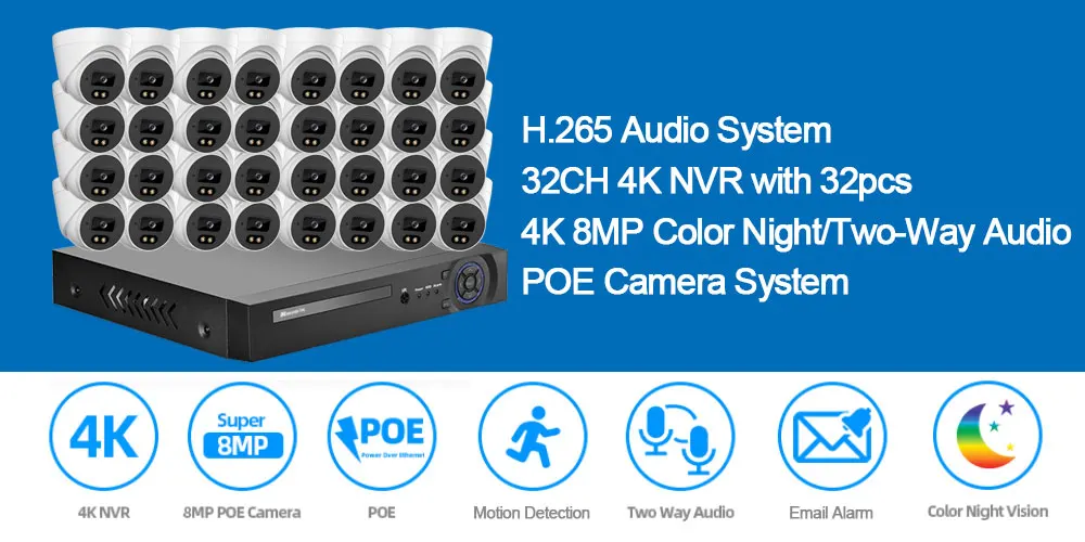 1. Ультра HD 4K дисплей высокой четкости, NVR может поддерживать 8 МП и 4K max, вы можете подключить 720p,1080p,3mp,4mp ,5mp, камеры 8mp & 4k с нашим NVR;2. Ультра HD 8MP POE ip-камера, подходит для внутреннего и наружного использования, надежная Домашняя безопасность;3. Наш NVR поддерживает распознавание лиц, воспроизведение лиц, обеспечивает ультра высокое разрешение видео наблюдения, обеспечивая максимальную детализацию и четкость в наличии;4. Наш NVR и камеры поддерживают расширенное H.265 Сжатие видео,5. Все камеры встроены в микрофон и динамик, Поддержка двусторонней аудиозаписи;6. Все камеры поддерживают Ultra HD Full Color Day Night Vision;7. Поддержка обнаружения движения, оповещения по электронной почте, воспроизведения видео и многоязычности;8. Поддержка Android,Iphone,Ipad,PC,VMS,P2P view;9. Удаленный доступ в любом месте, в любое время;