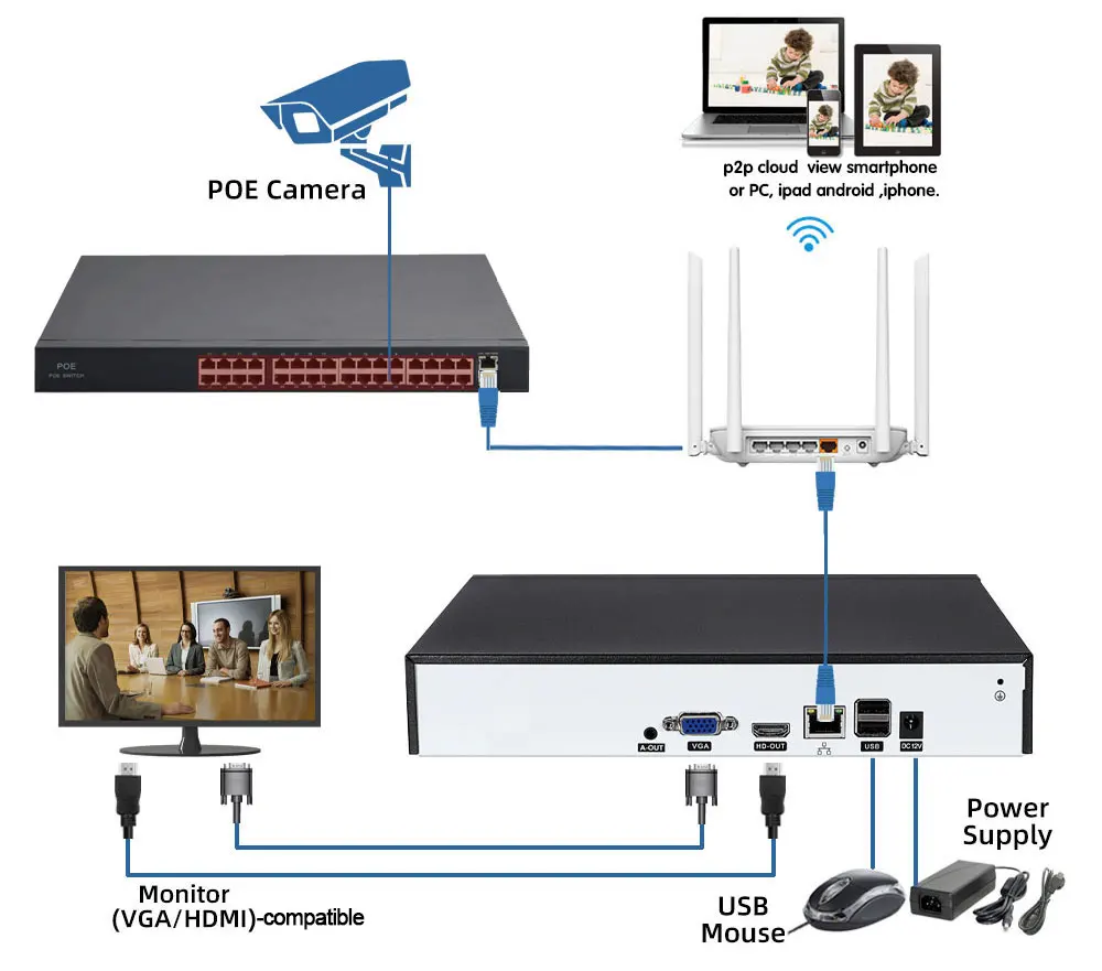 Простая настройка, всего 4 шага для просмотра мобильный телефон, просмотра видео в режиме реального времени из любого места и в любое время с помощью смартфона, стола или ПК с передовой технологией P2P, вы можете получить удаленный доступ к вашей системе за считанные минуты или меньше, нет необходимости в переадресации, удаленный доступ никогда не был таким простым!