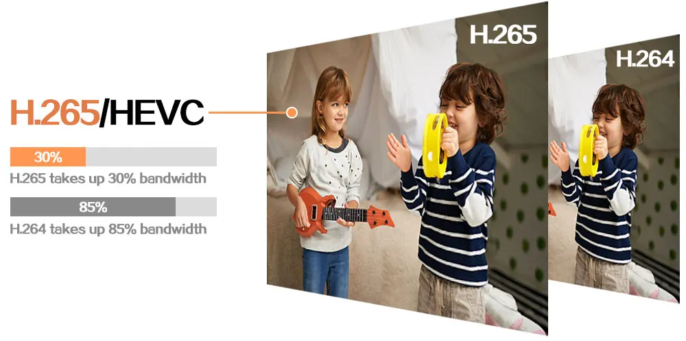 H.265 более четкий, HD разрешение предлагает вам лучшее качество изображения в более низкой скорости. Экономьте больше места для хранения, вы можете уменьшить размер файлов 40%-50%, сэкономить место для хранения HDD и снизить стоимость покупки.