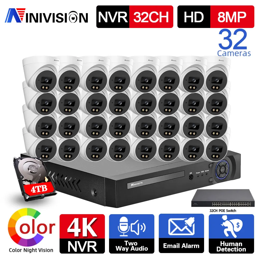 NINIVISION H.265 32CH 8MP NVR 4K домашняя цветная Двухканальная аудио POE IP камера комплект 4K цветная система ночного видео безопасности