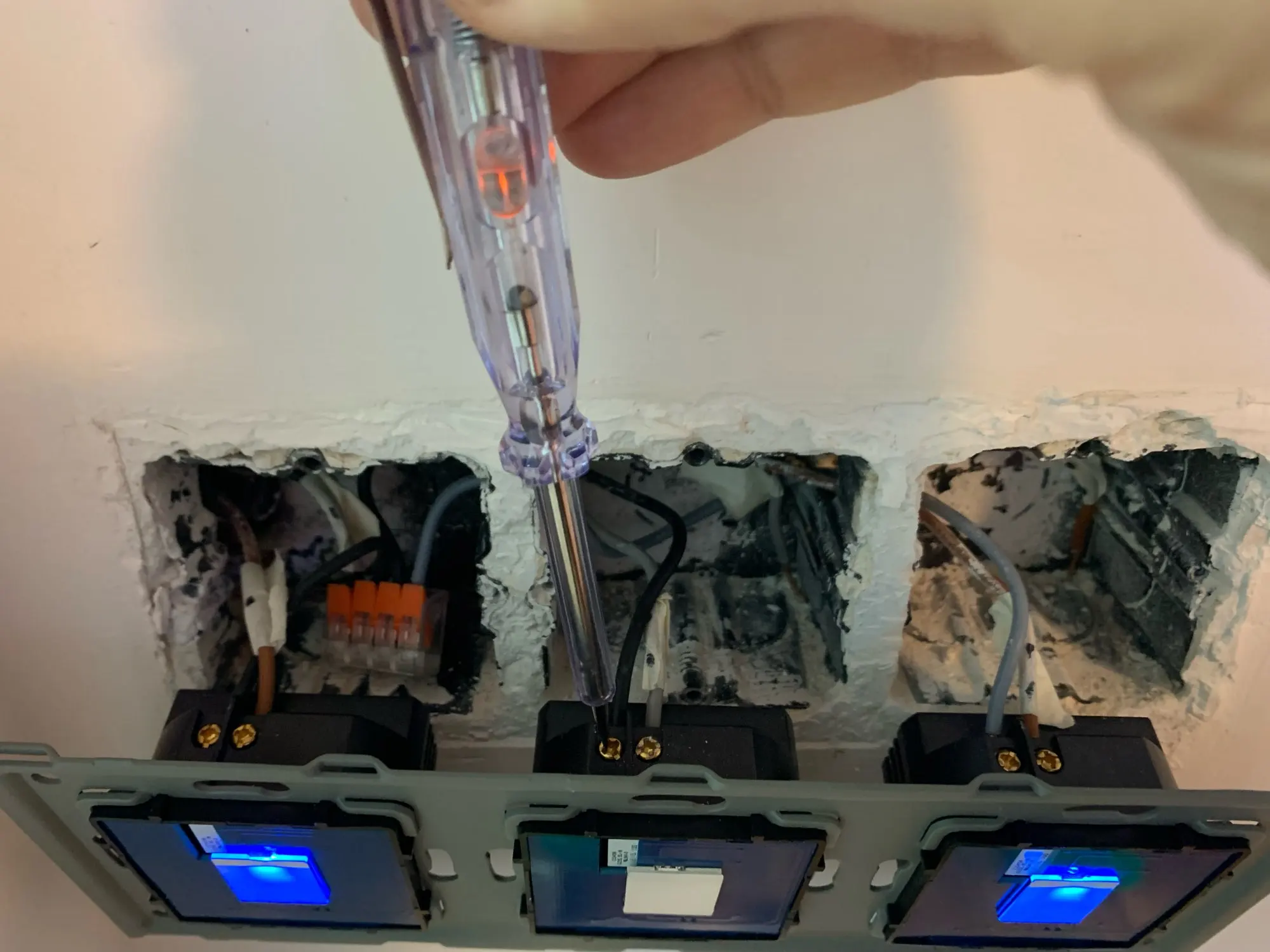 A:Синяя подсветка будет включаться, когда проводка пройдет успешно. Позволяет вам четко заметить наш сенсорный выключатель в темноте.