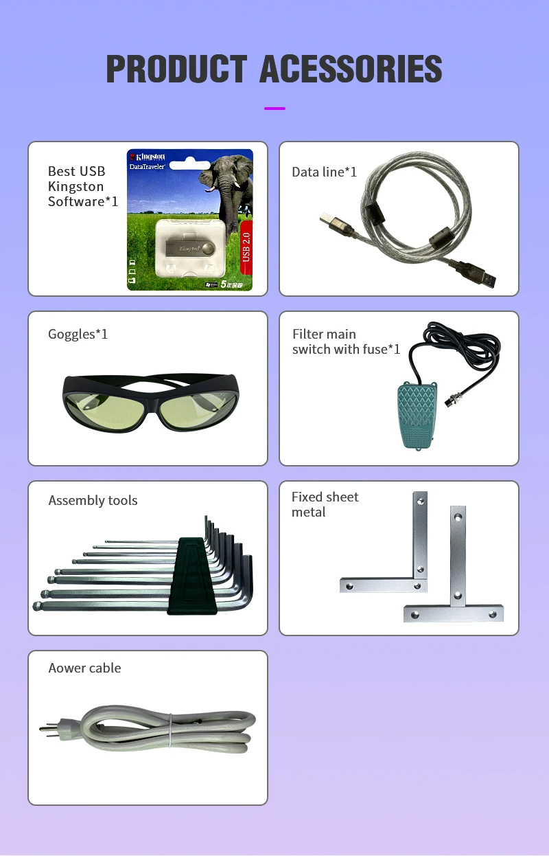 Мы поставляем программное обеспечение с лучшим USB Kingston для вашей безопасности данных.Запасные части для резервного копирования, такие как кнопка резервного копирования для аварийного использования.Позиционирование стержней для легкого определения правильного положения для ваших гравировальных изделий.
