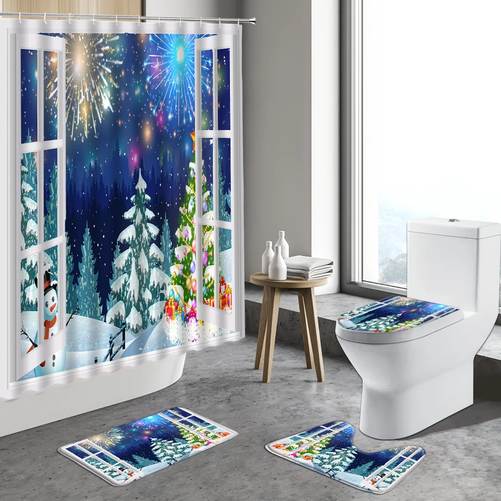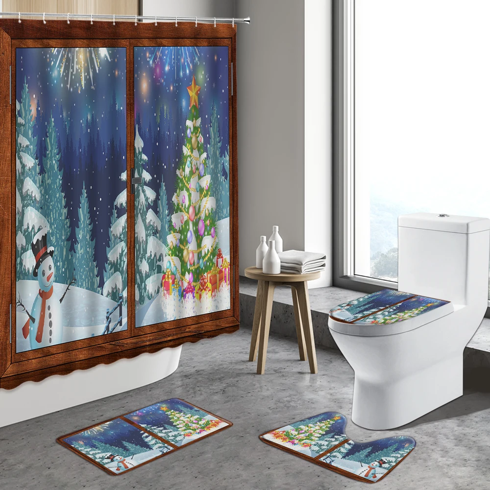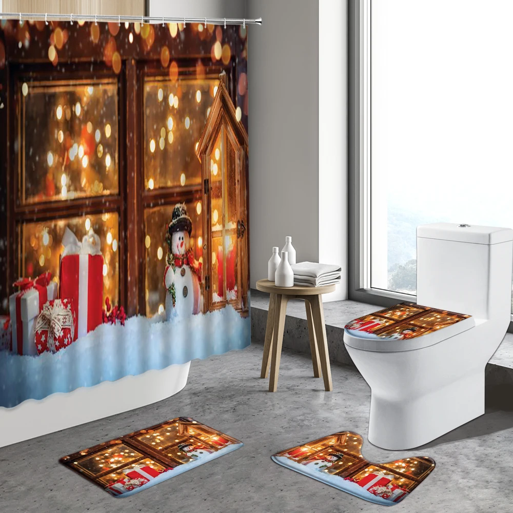 Рождественская занавеска для душа в комплекте, коврик для ванной, деревянное окно в стиле ретро, мультяшный Белый Снеговик, зимний праздничный декор, нескользящий коврик для ванной комнаты