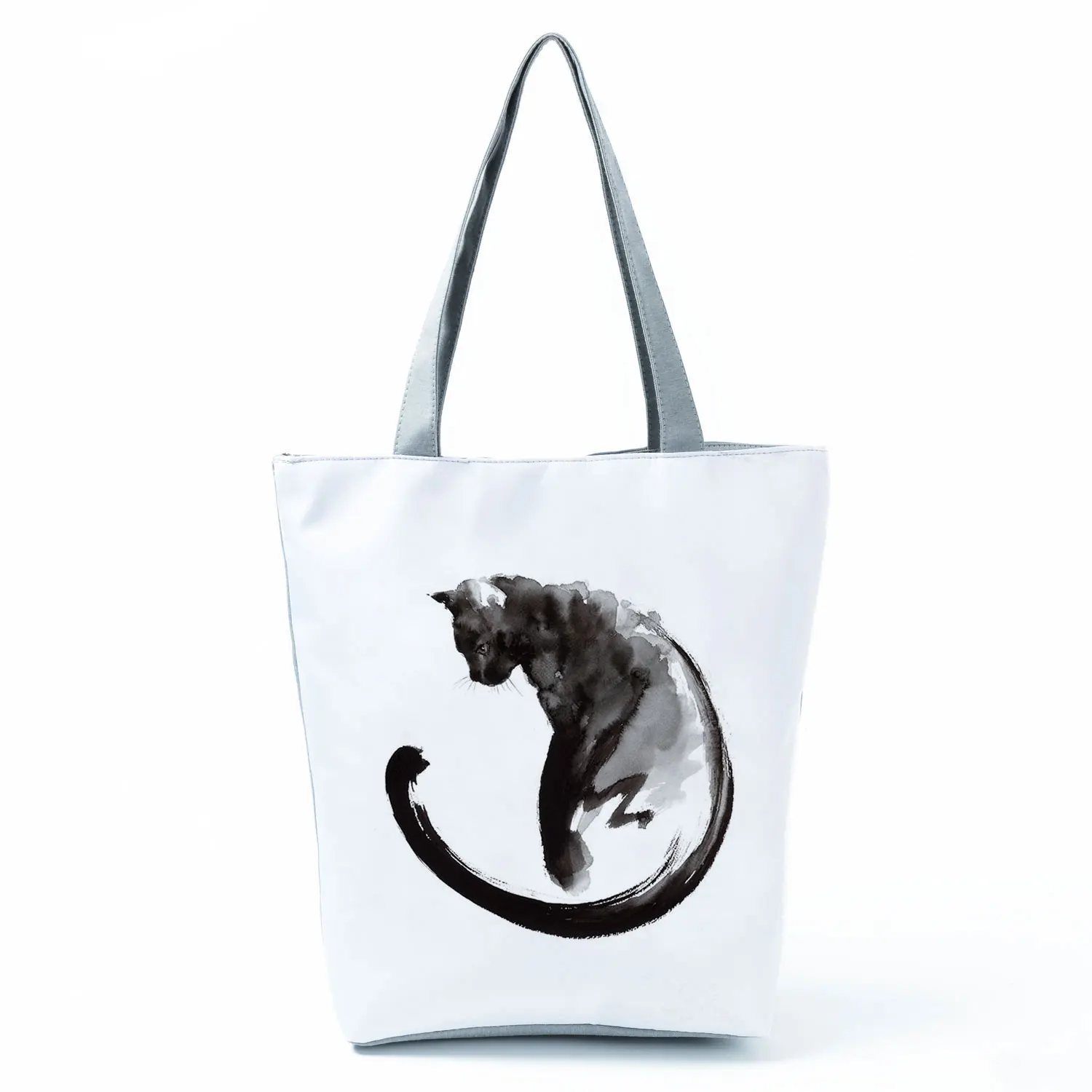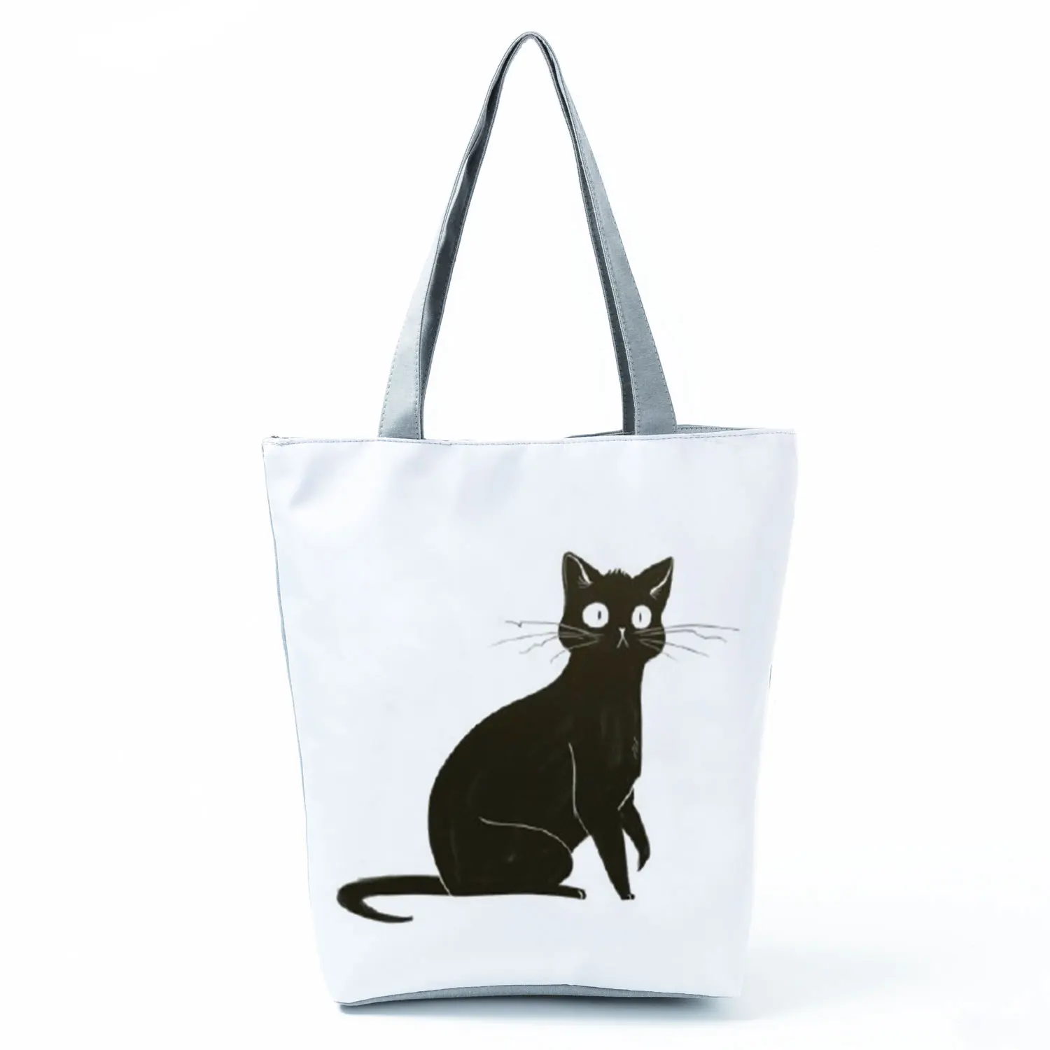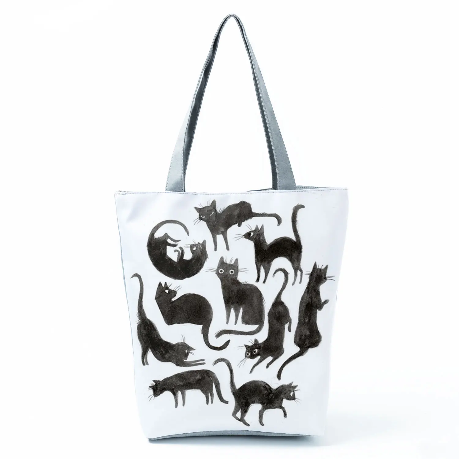 Вместительные сумки с животным дизайном, женская сумка, черная сумка-шоппер с принтом кошки, сумки, многоразовые повседневные сумки на плечо с индивидуальным рисунком