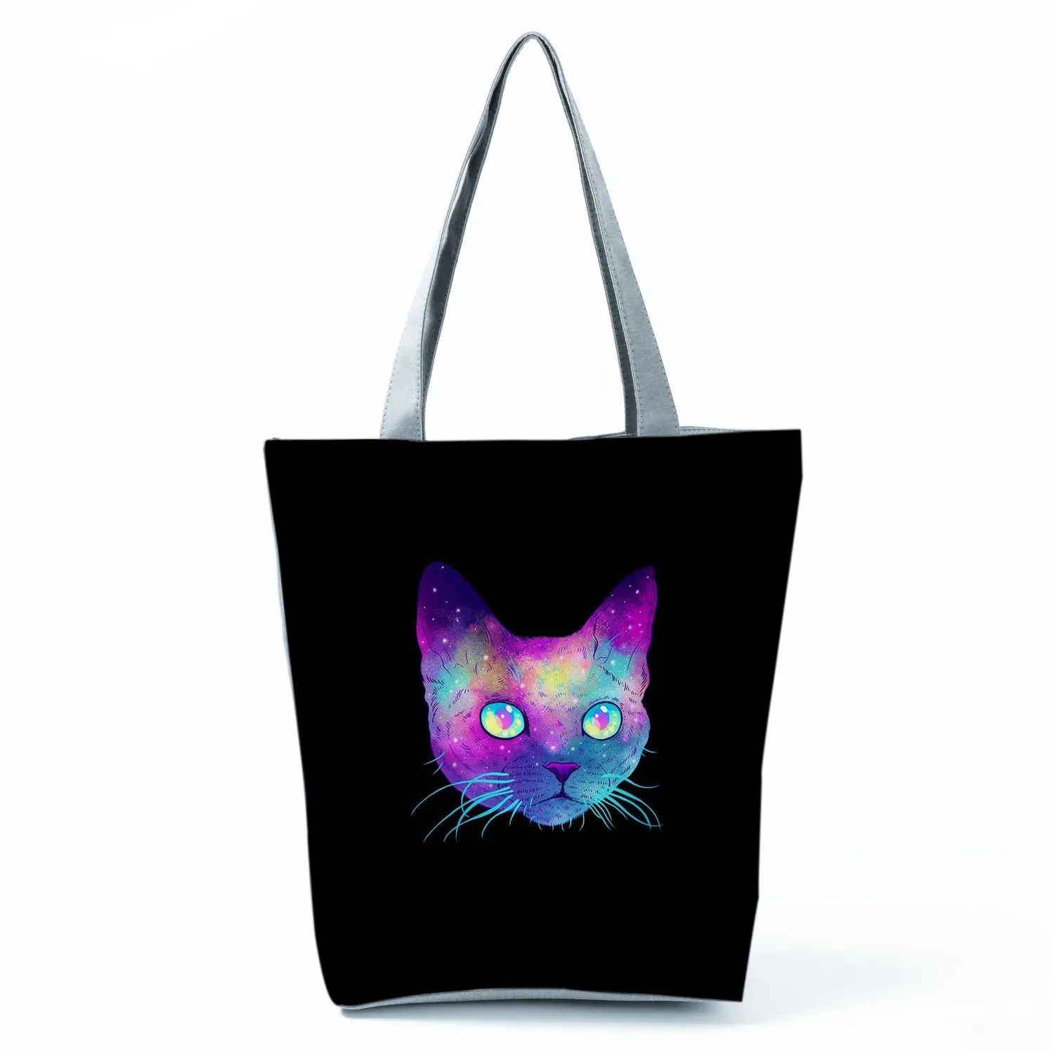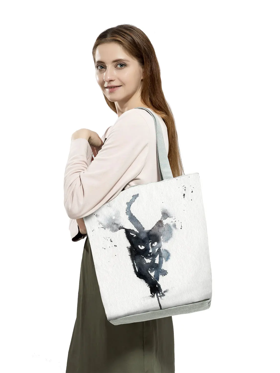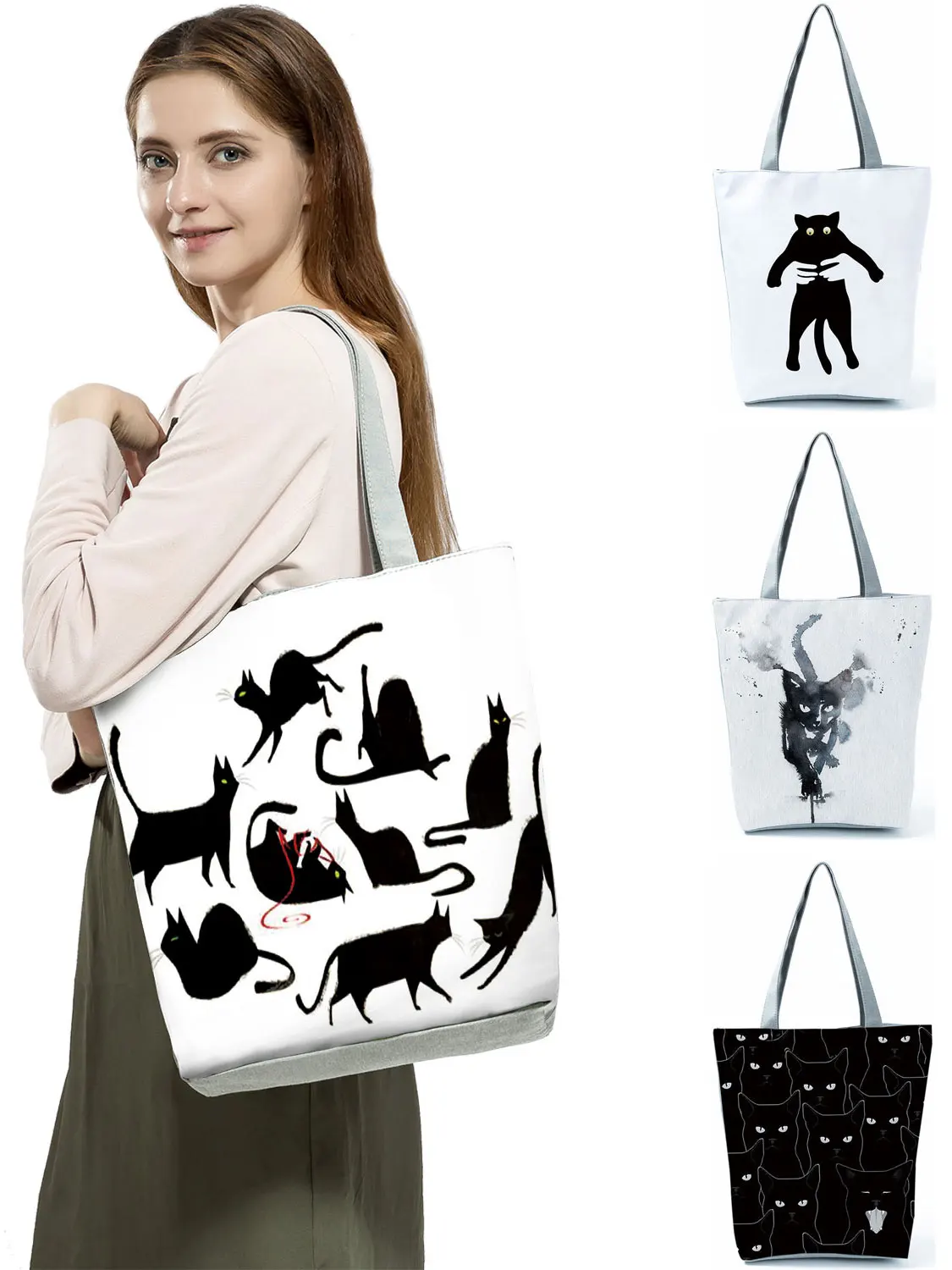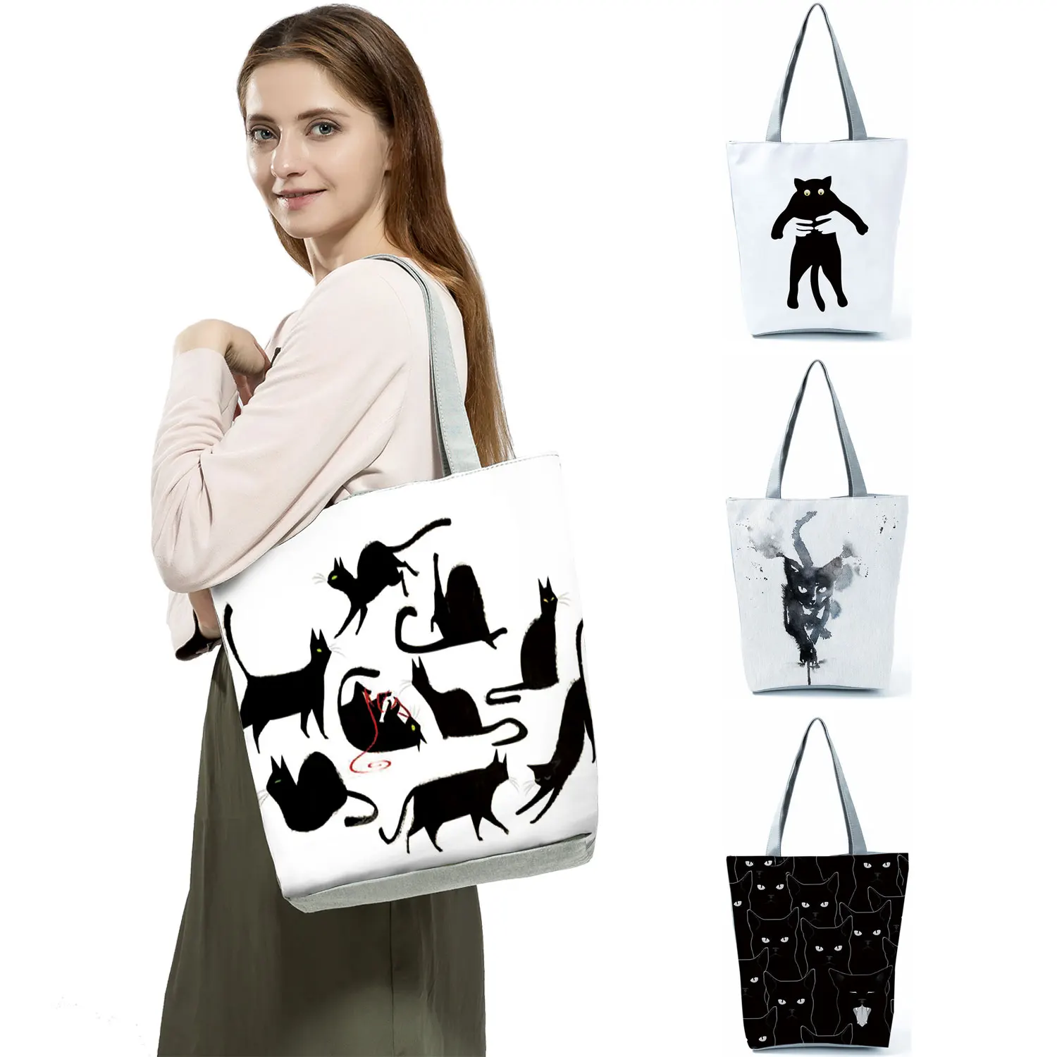 Вместительные сумки с животным дизайном, женская сумка, черная сумка-шоппер с принтом кошки, сумки, многоразовые повседневные сумки на плечо с индивидуальным рисунком