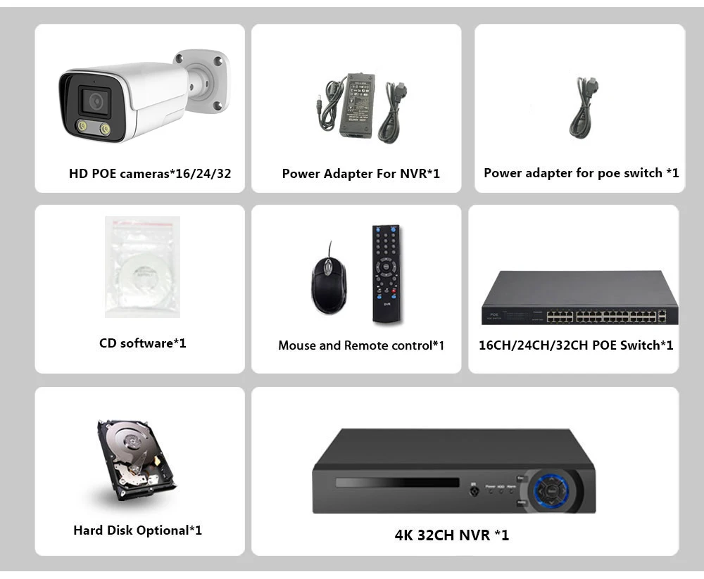 1 сетевой видеорегистратор 32CH 4K NVR;16/24/32 x HD 8.0MP POE IP Крытый Открытый ИК День ночного видения атмосферостойкие камеры;1x16/24CH/32CH POE переключатель1x источник питания для POE Switch1 x Блок питания для NVR;1 х USB мышь для NVR;1 компакт-диск программного обеспечения для NVR;1 пульт дистанционного управления для NVR;Жесткий диск опционально!