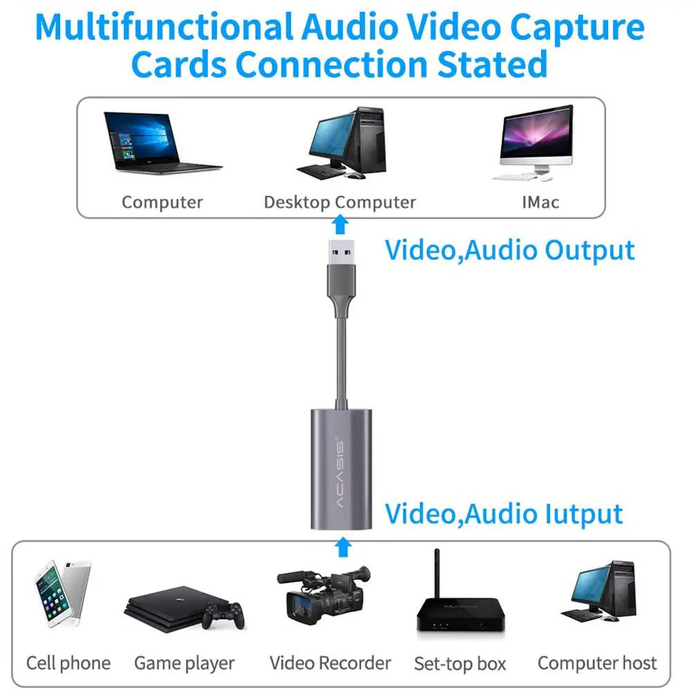 HD 1080P 30 кадров в секунду-Поддержка видеозахвата Входное Максимальное разрешение 3840 × 2160 @ 30 Гц, выходное максимальное разрешение 1920 × 1080 @ 30 Гц.Подключи и работай, без драйвера или внешнего источника питания. Совместим с большинством сторонних программ, он может быть подключен и играй для Windows, для Ma OS X и для Linux.Высокая скорость работы, снимайте и производите в пределах Ваших любимых инструментов записывайте видео непосредственно на жесткий диск без задержки времени.Подходит для получения высокой четкости, игр захвата обучения записи, встречи, медицинских изображений и т. Д.Карта захвата игры подходит для устройств с выходом HDMI, таких как устройства для PS4, для Xbox one, для Wii U и для переключателя. Небольшой размер и легко носить с собой