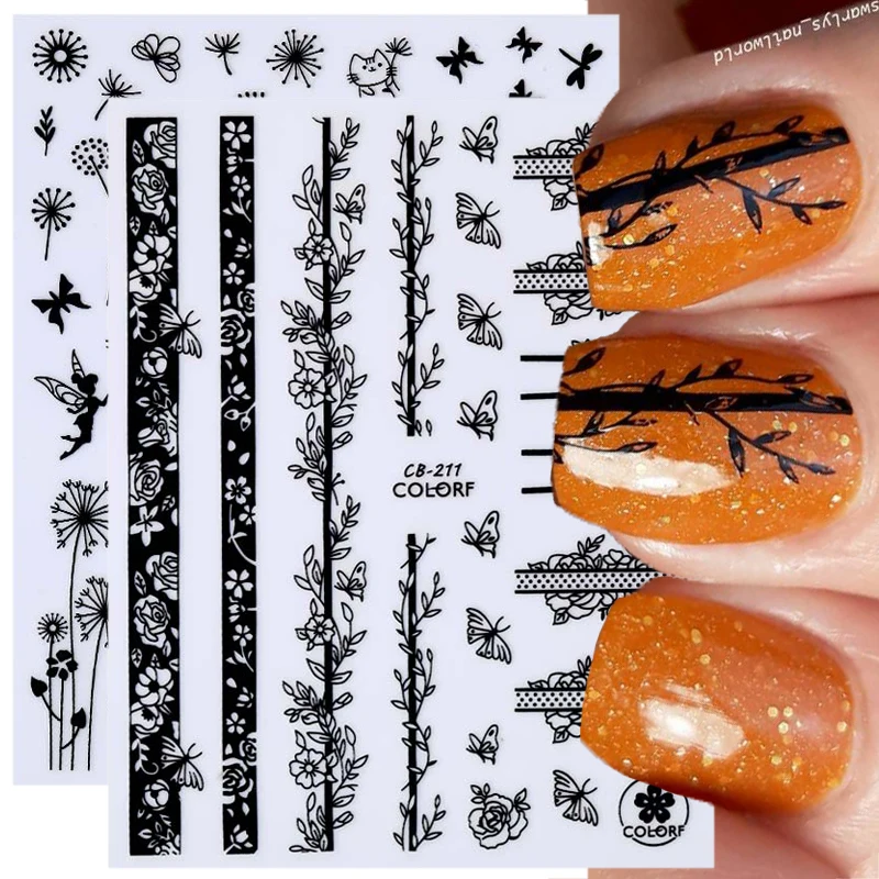 Черные линии Цветы Листья 3D наклейки для ногтей осень зима осень лист дизайн Переводные слайдеры Абстрактные Волны Дизайн ногтей наклейки декор