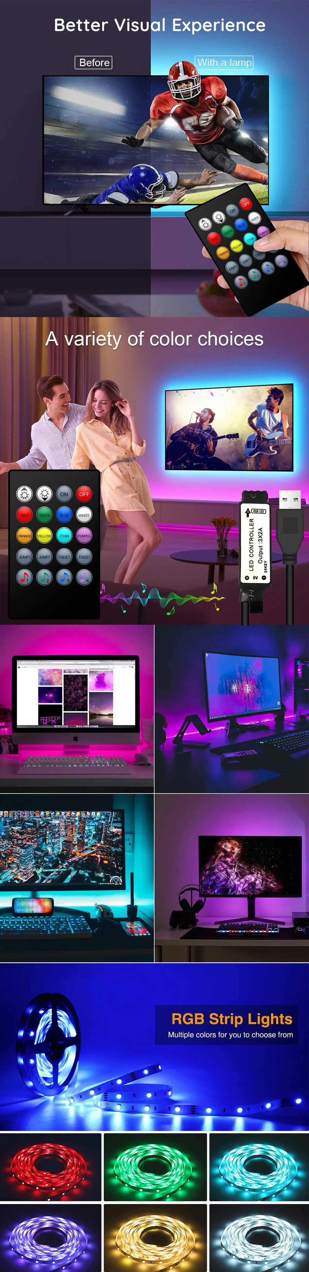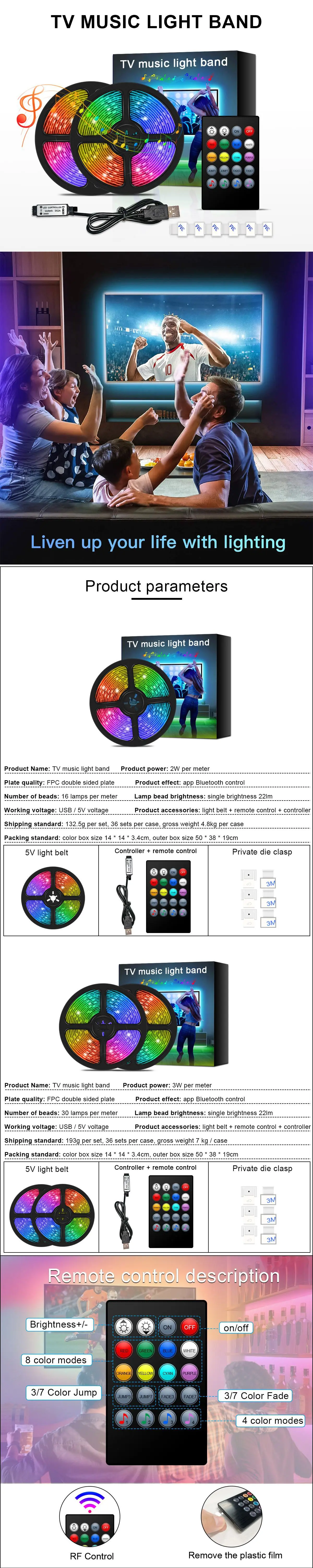 Светодиодная ленсветильник 5050RGB для телевизора, цветное освещение с музыкальным управлением, 20 клавишами, USB, для декора комнаты, праздника, вечеринки, игры, атмосферсветильник